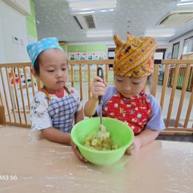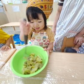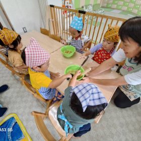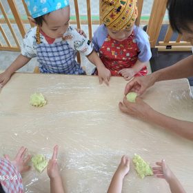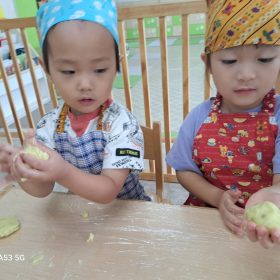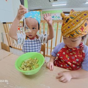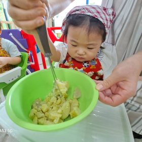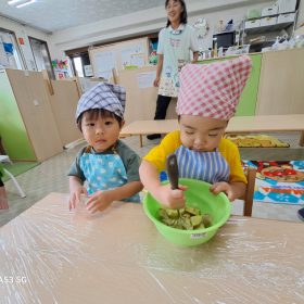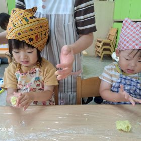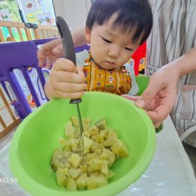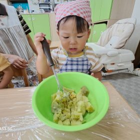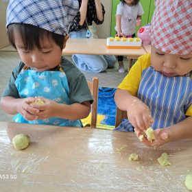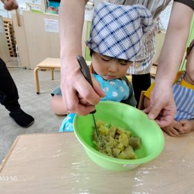 2025.09.25 🍠クッキング🍠 今日は皆でクッキング\(^^)/ スィートポテトを作りました🤗 茹でたさつまいもを順番に潰して、牛乳、お砂糖、バターを入れて作った生地を、自分達で丸めました♥️ おいしくなぁれ~と魔法をかけながら上手に丸めて形を作ったね🥰 皆がお昼寝中に焼いて、おやつの時間に頂きまーす😆 食べるの 楽しみだね😋 PREV NEXT