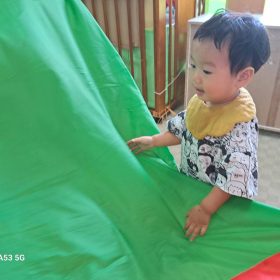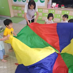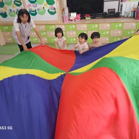 パラバルーンで音楽に合わせてユラユラ揺らしたり、中に入って隠れたり、ボールを乗せて転がしたり、皆でワイワイキャッキャッ賑やかな時間を過ごしました♥️