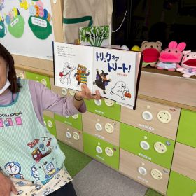 トリックオアトリートの絵本を見て、合言葉を覚え…仮装してお菓子🍭をもらいにレッツゴー😆