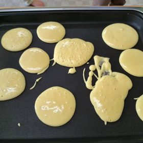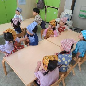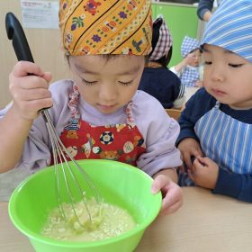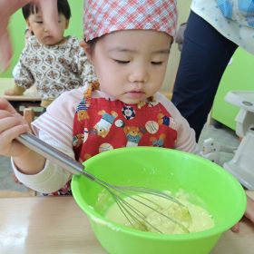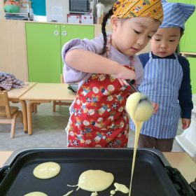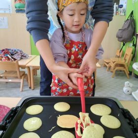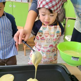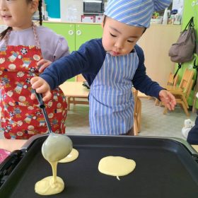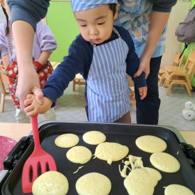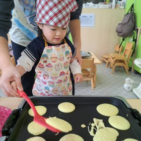大きいお友達はホットプレートに生地を入れて、ひっくり返すのにも挑戦しました😆皆上手にできたね\(^o^)/