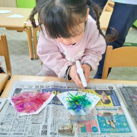 お雛様とお内裏様のお着物をコーヒーフィルターに水性ペンでお絵描きをし、霧吹きで水をかけて、色がにじんで混ざる変化を楽しみながら取り組みました♥️