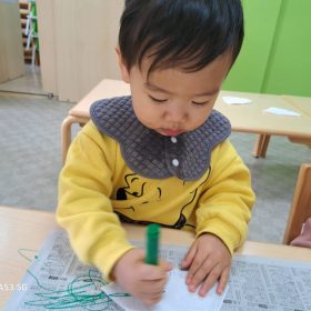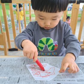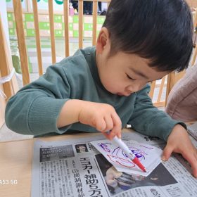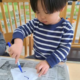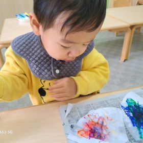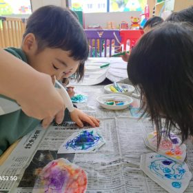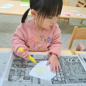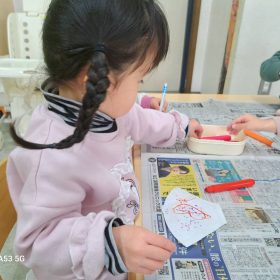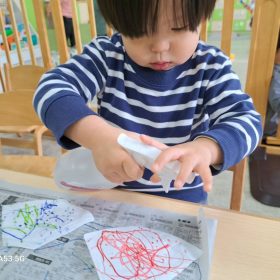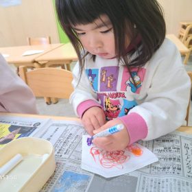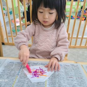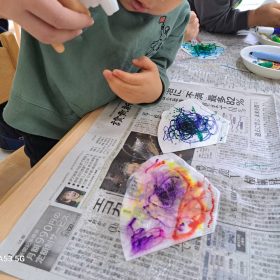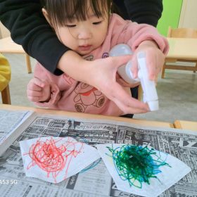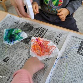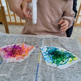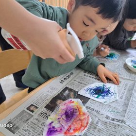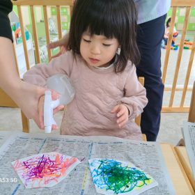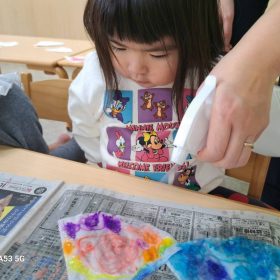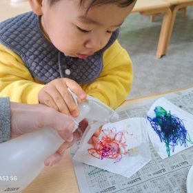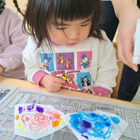 お雛様とお内裏様のお着物をコーヒーフィルターに水性ペンでお絵描きをし、霧吹きで水をかけて、色がにじんで混ざる変化を楽しみながら取り組みました♥️