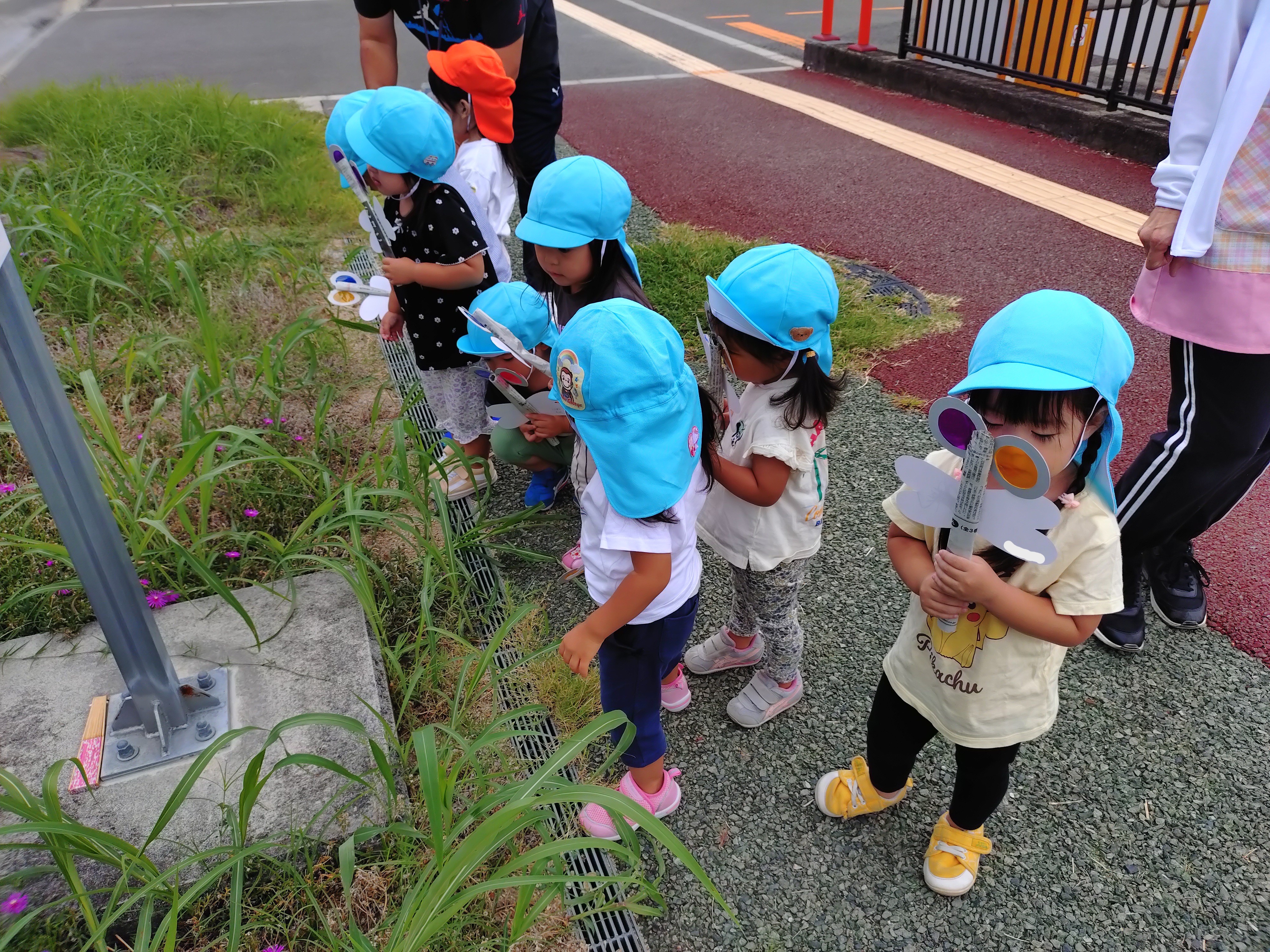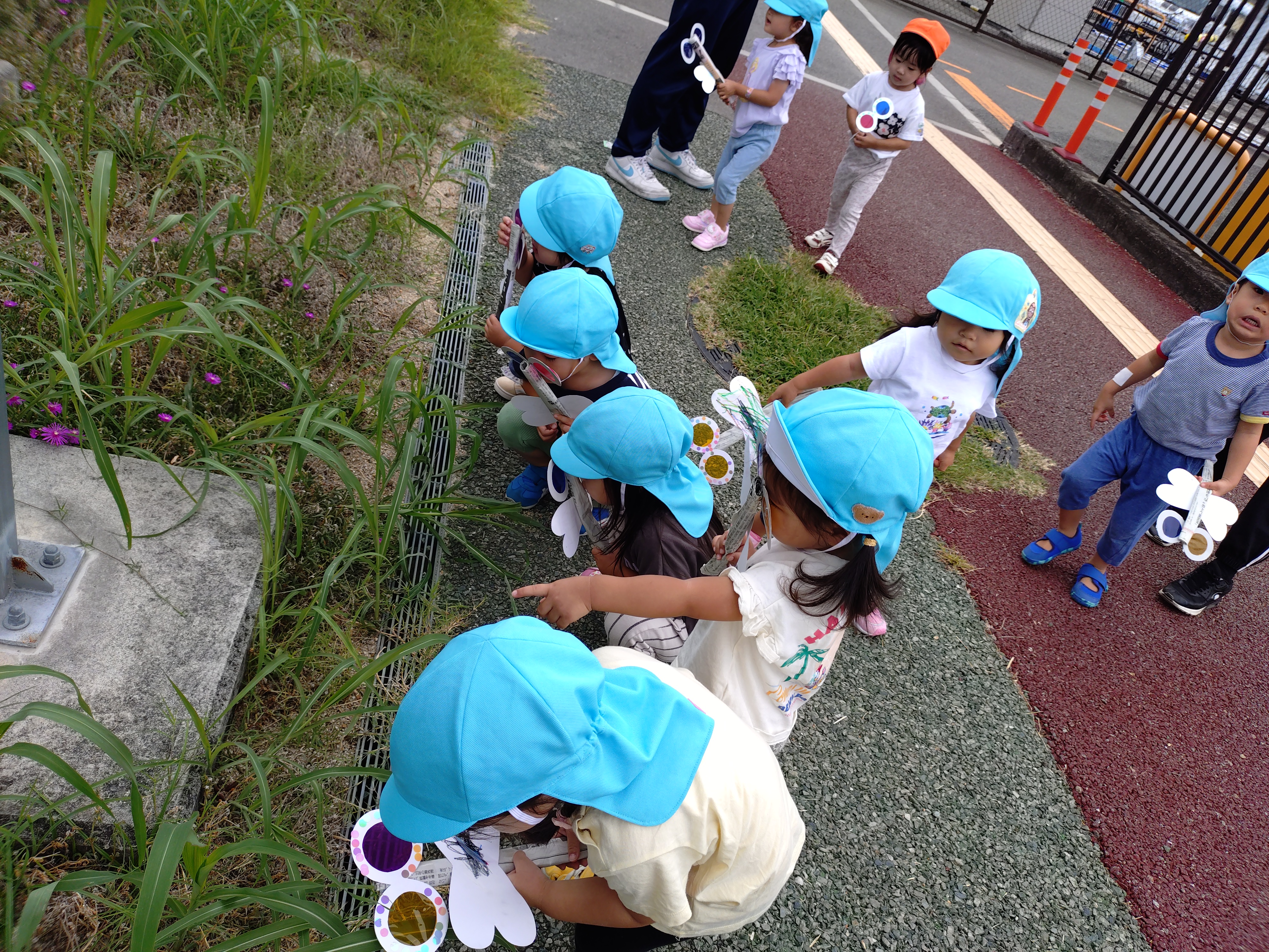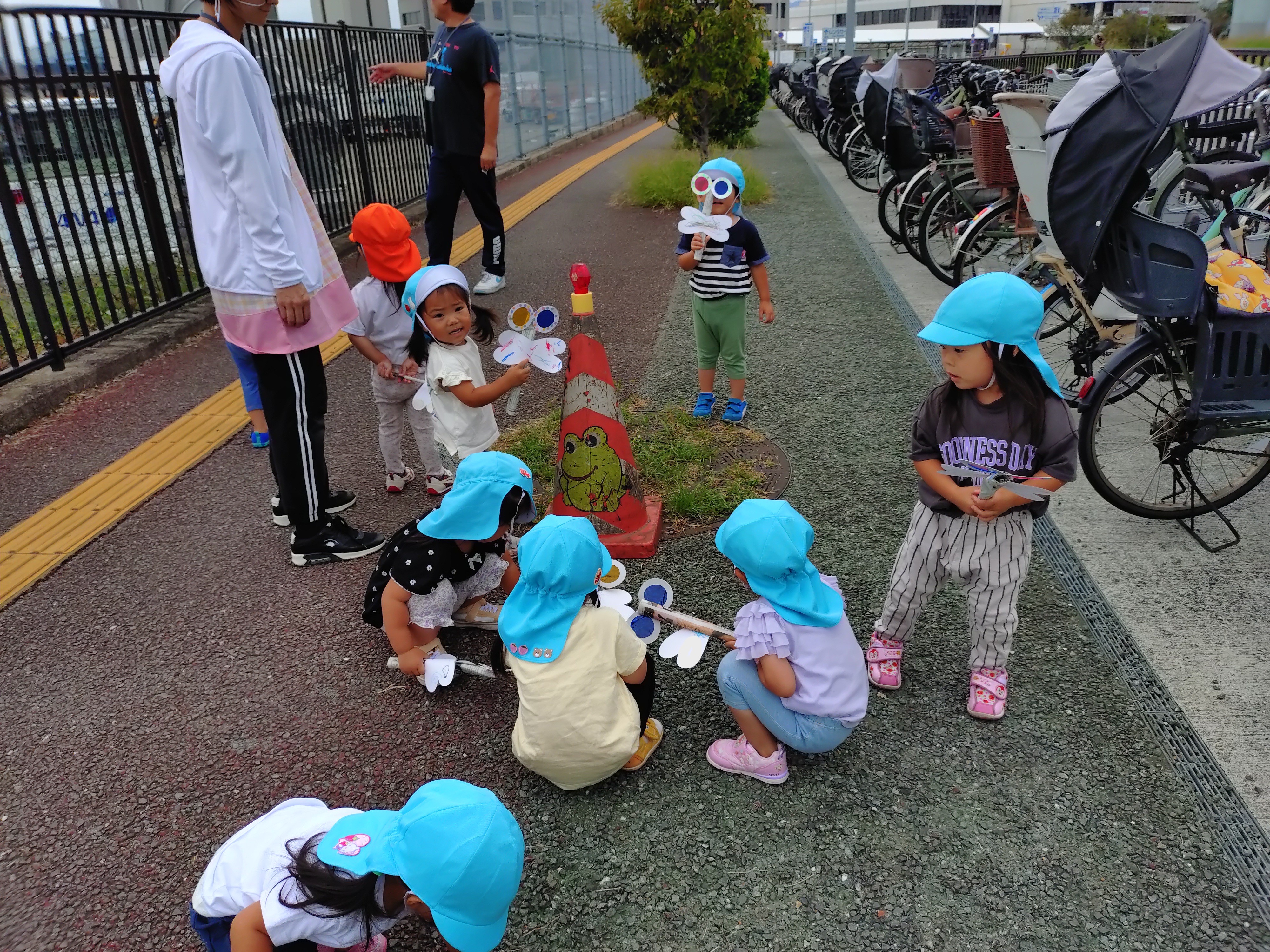 先日作った“トンボのめがね”が気に入ってくれている子ども達なので、めがねを持って探索散歩に出ましたよ。