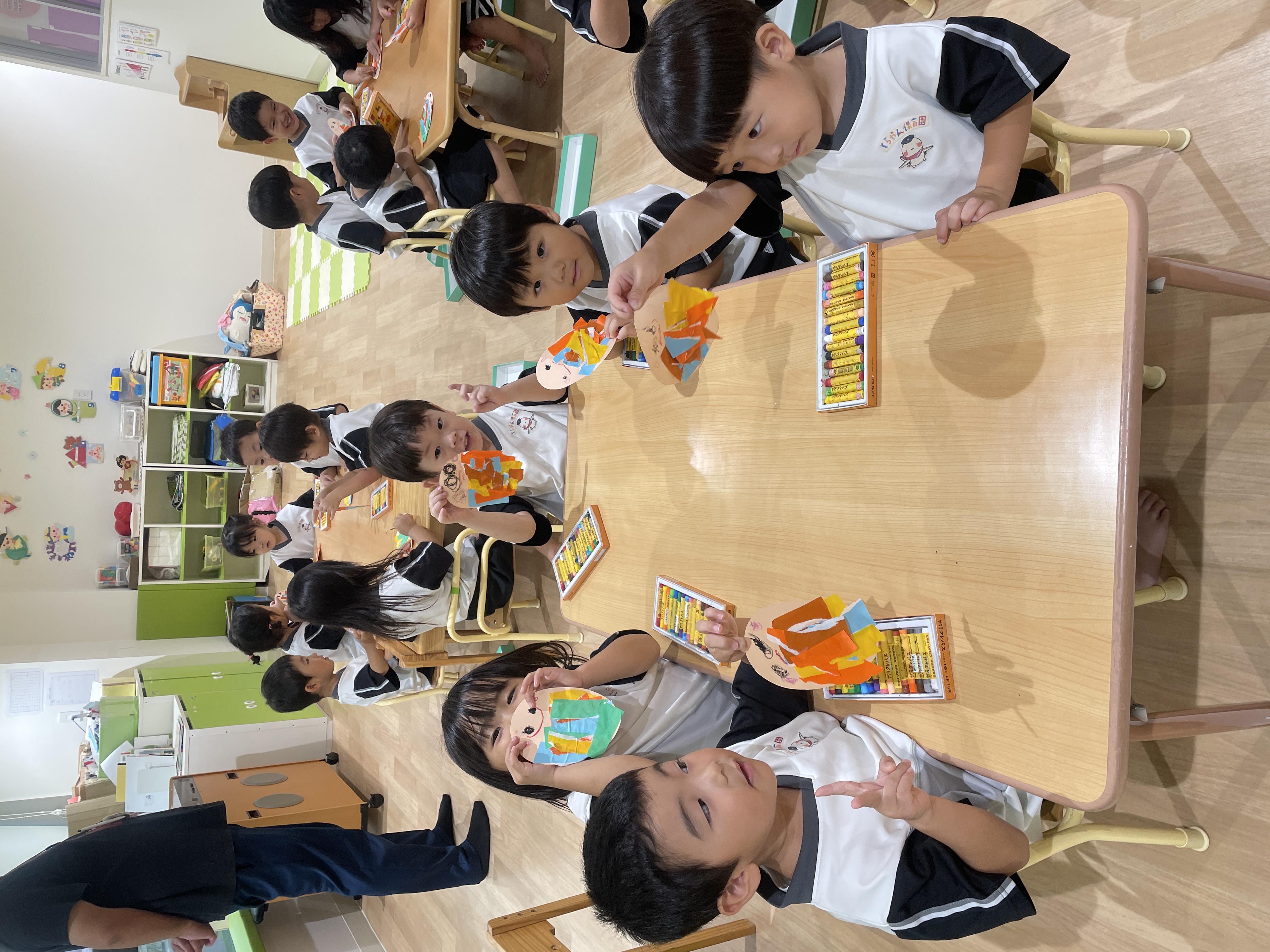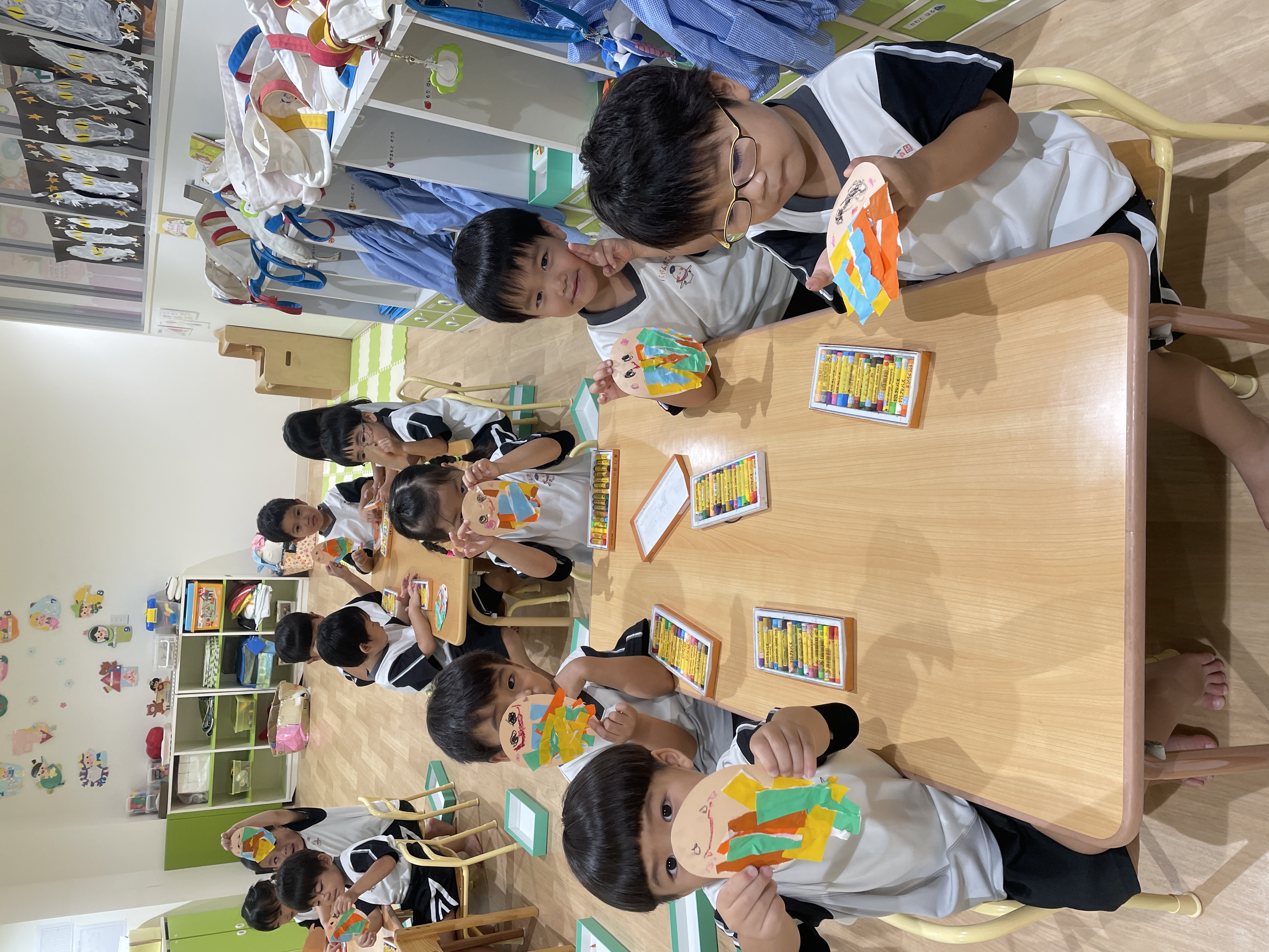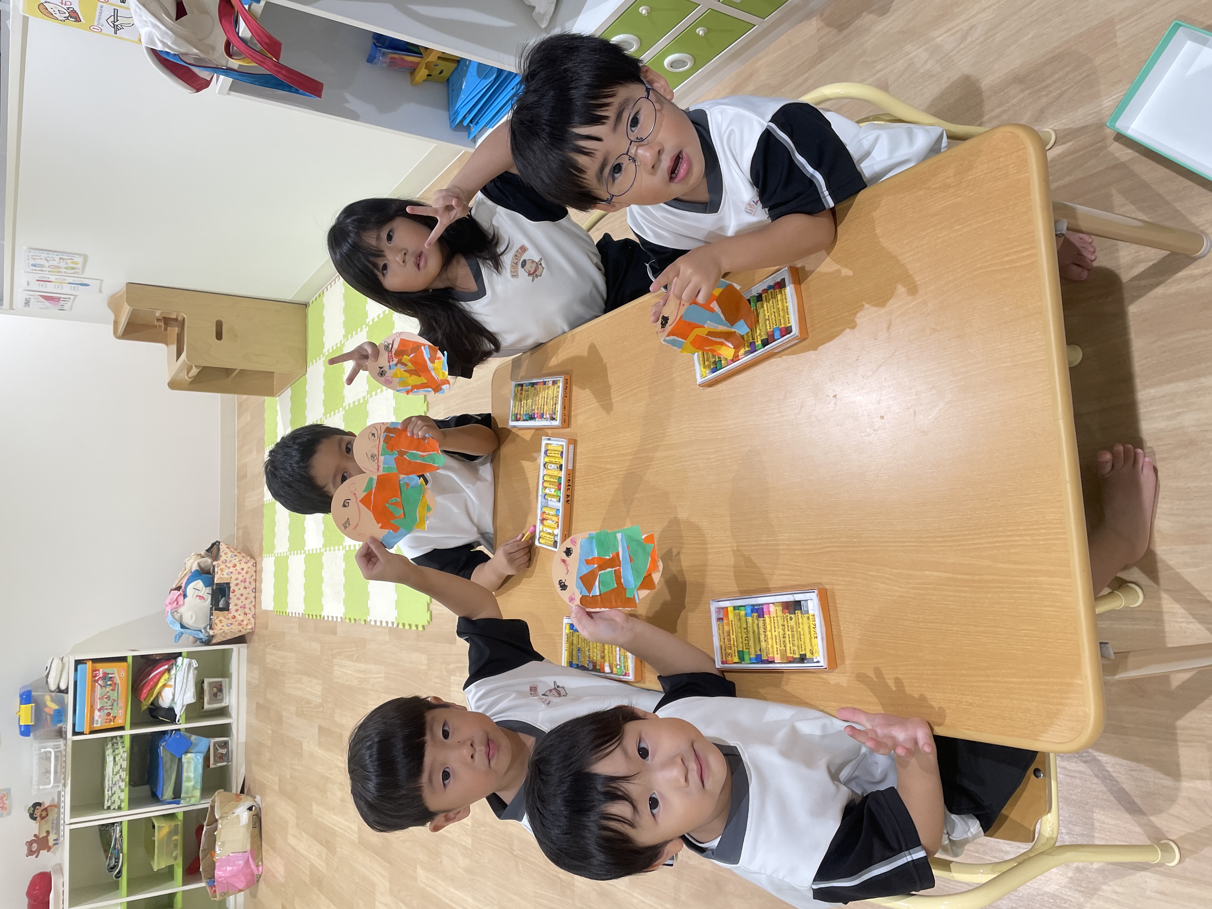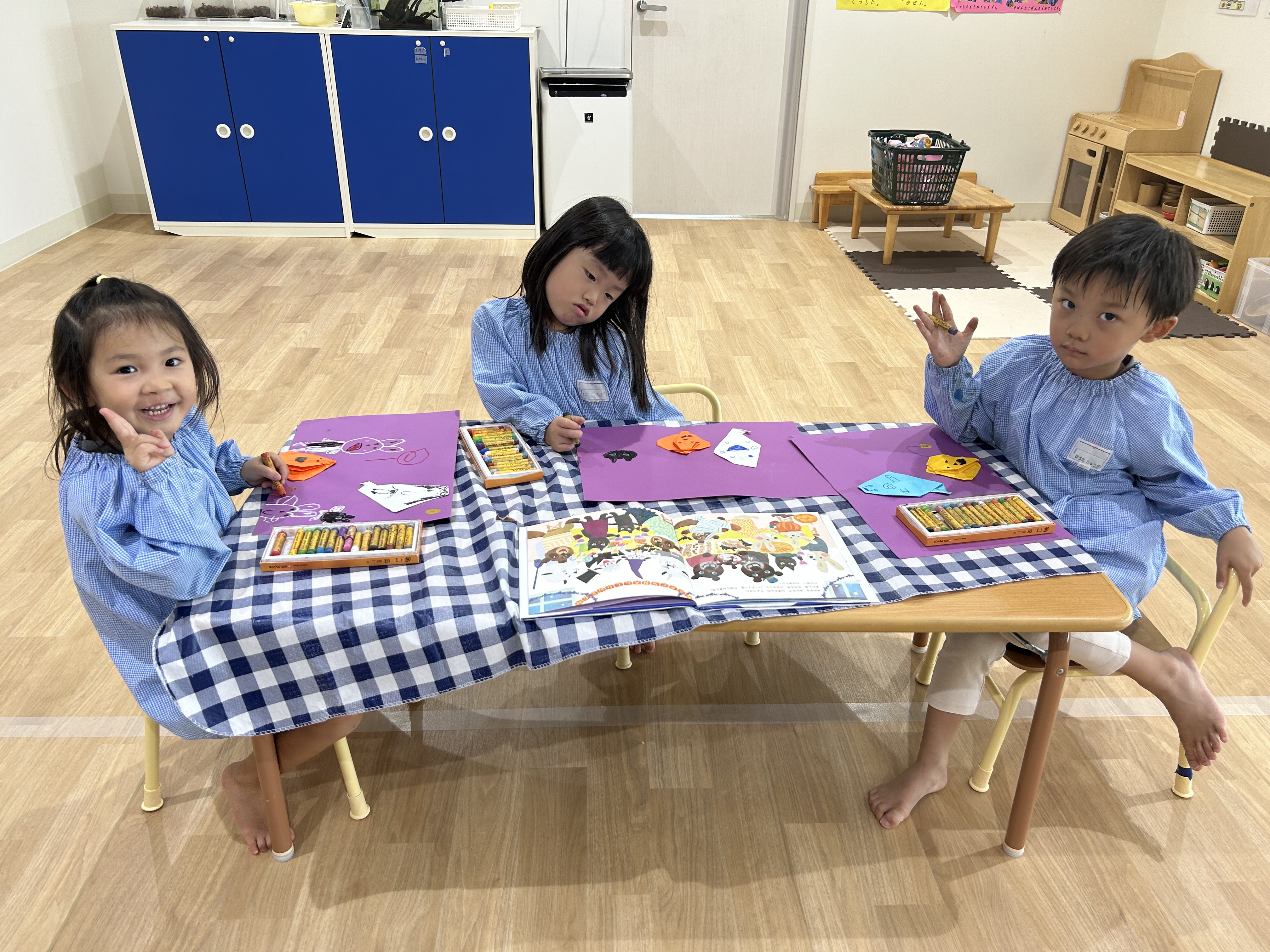 折り紙を糊で貼り、クレパスで思いおもいに絵を描いて仕上げました🎃みんなすごく上手に仕上がりましたよ🎵