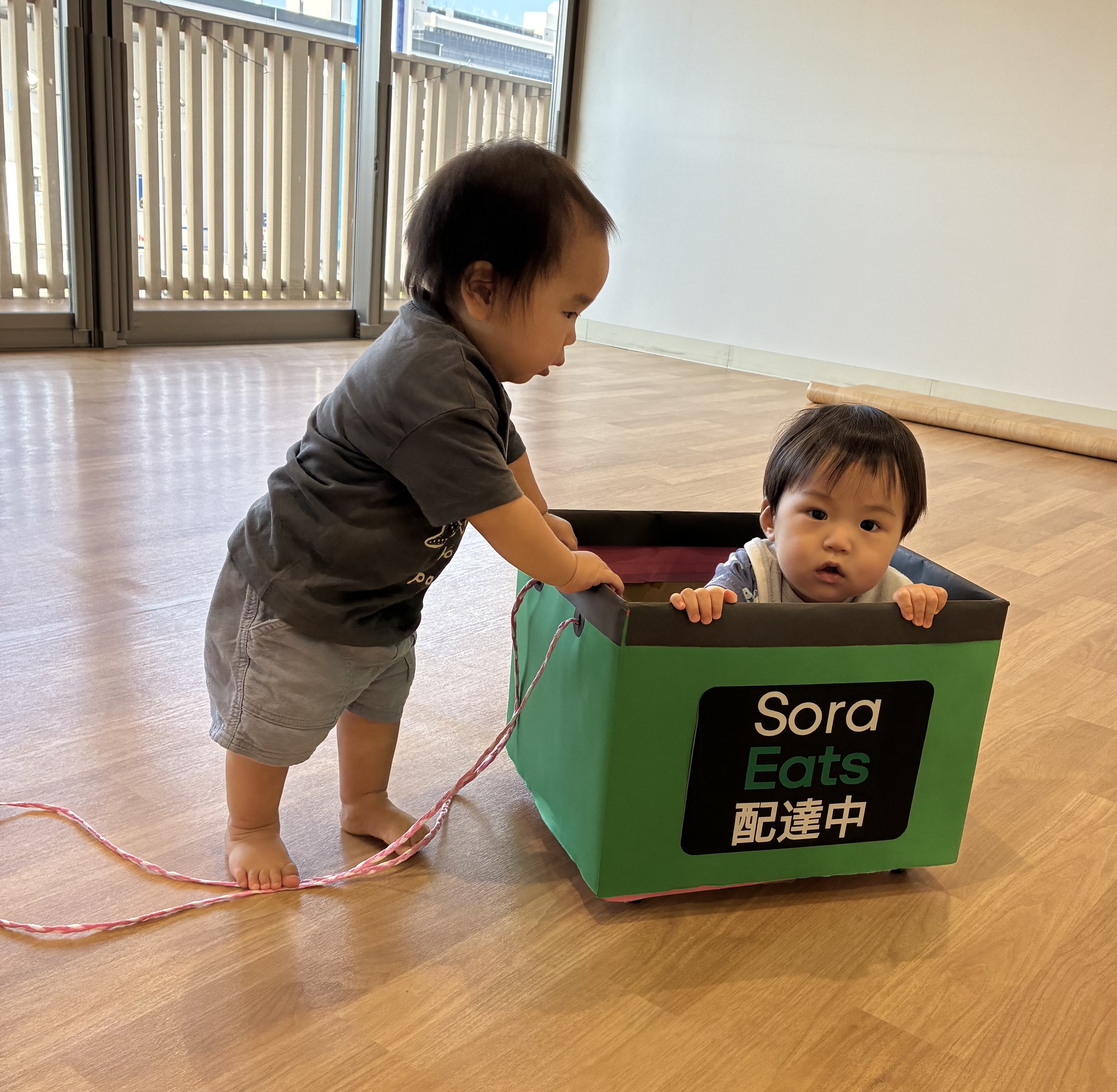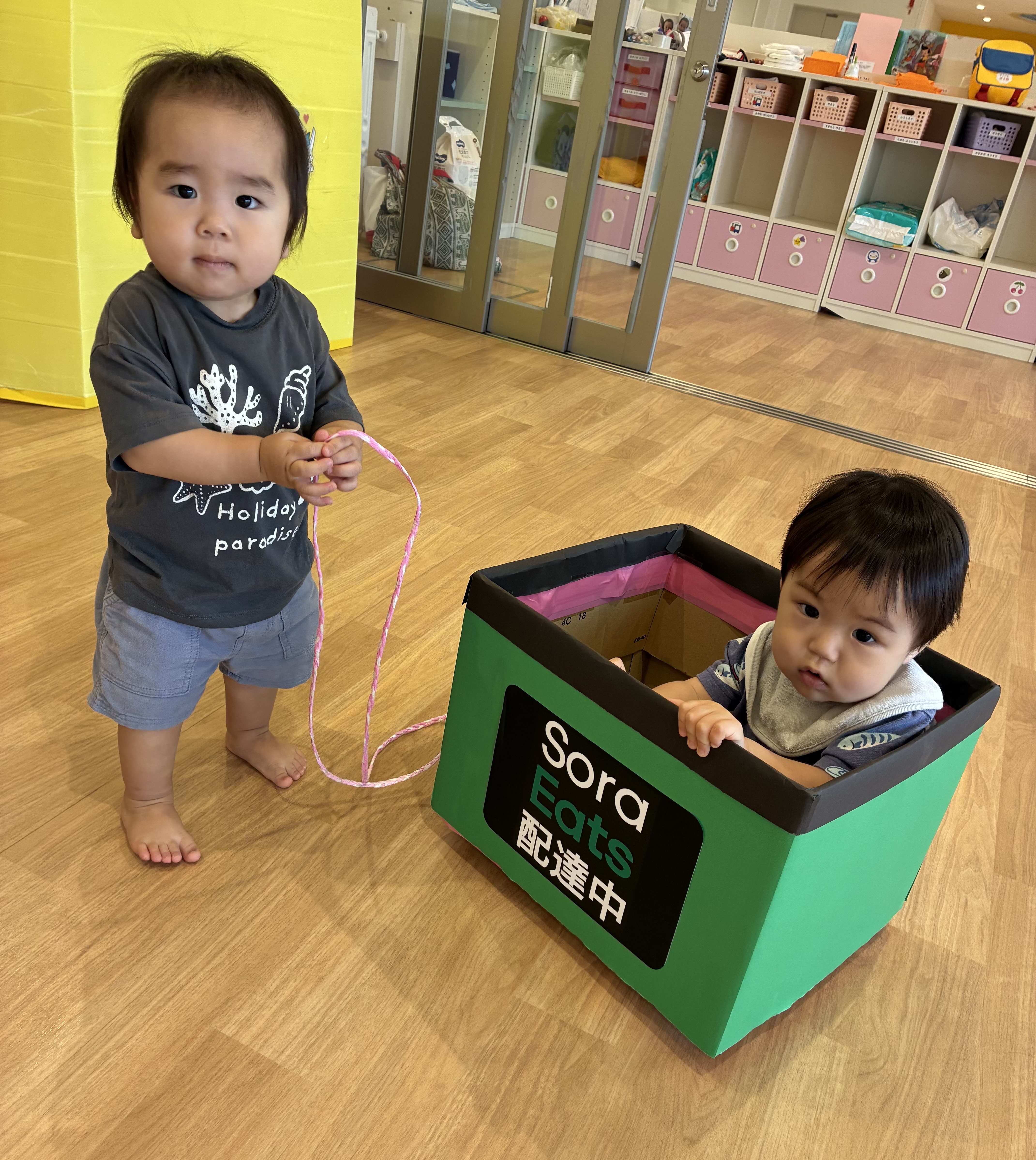 ゆきぐみの子どもたちは、朝からSora Eatsの車を見つけると1人で乗車。それを見つけて別の子がヒモを引き楽しんでる姿を発見❗️