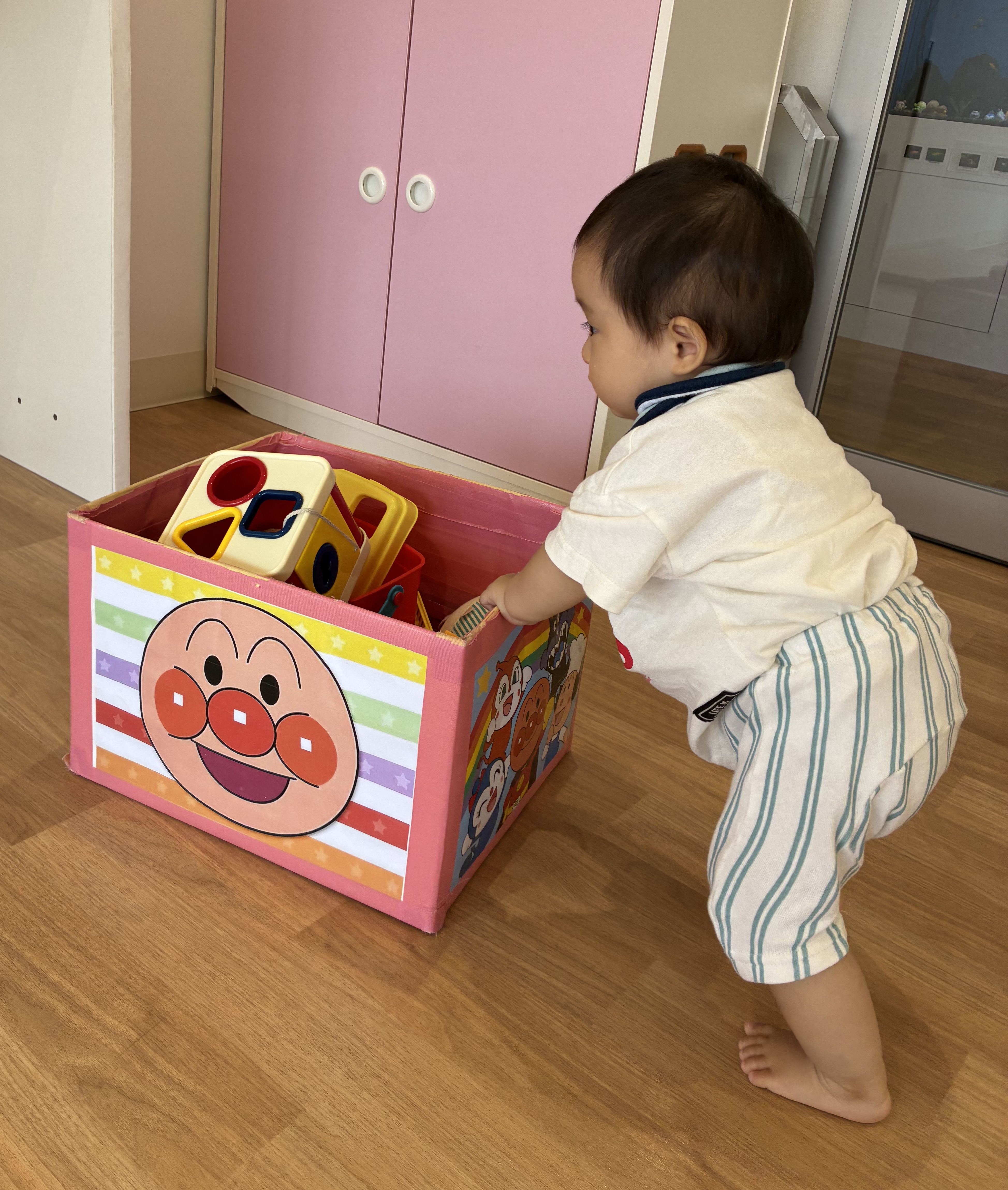 くつを履こうとしてるお友だちがいたと思ったら、こちらはお片付けしてくれるお友だち…