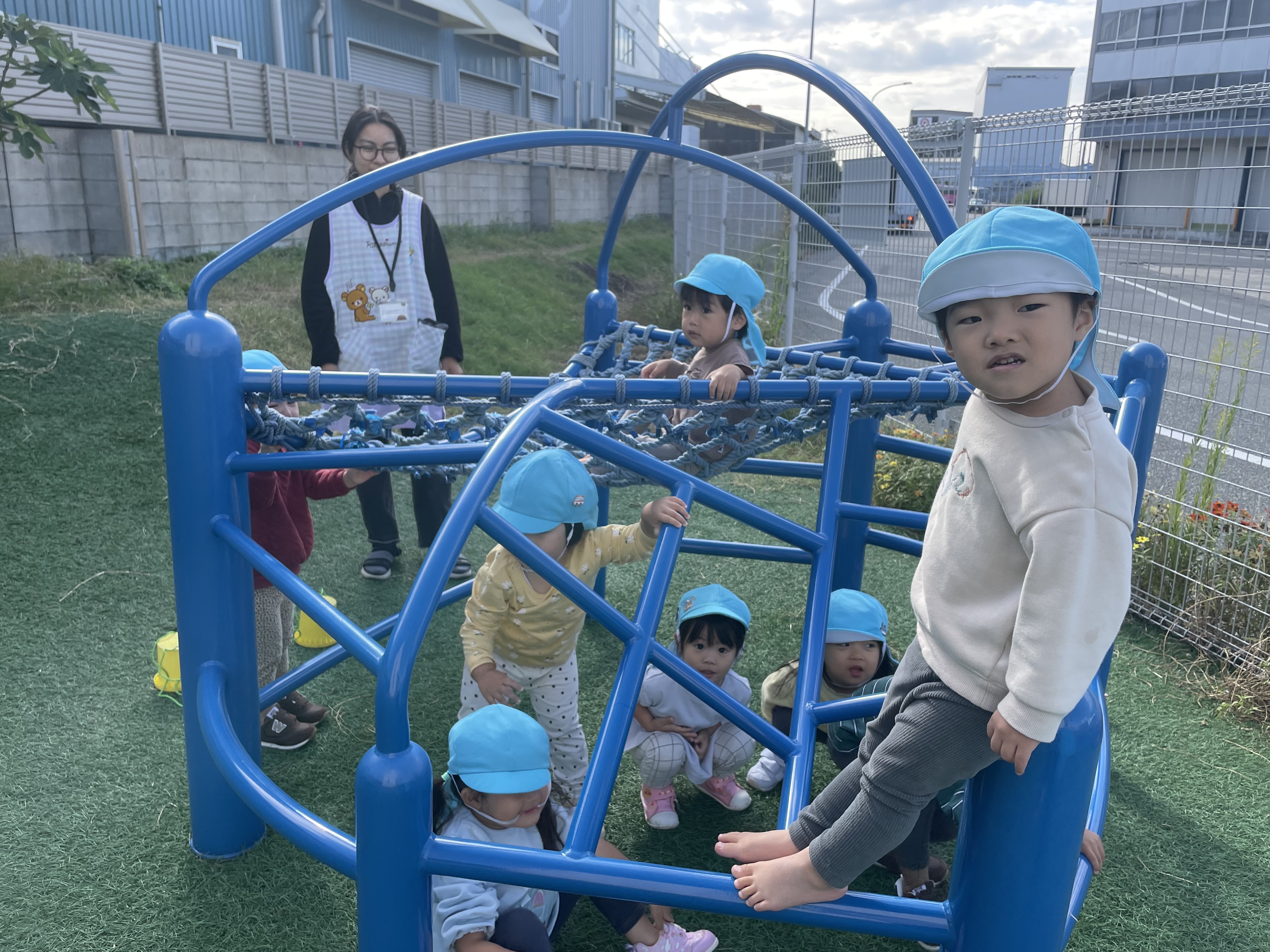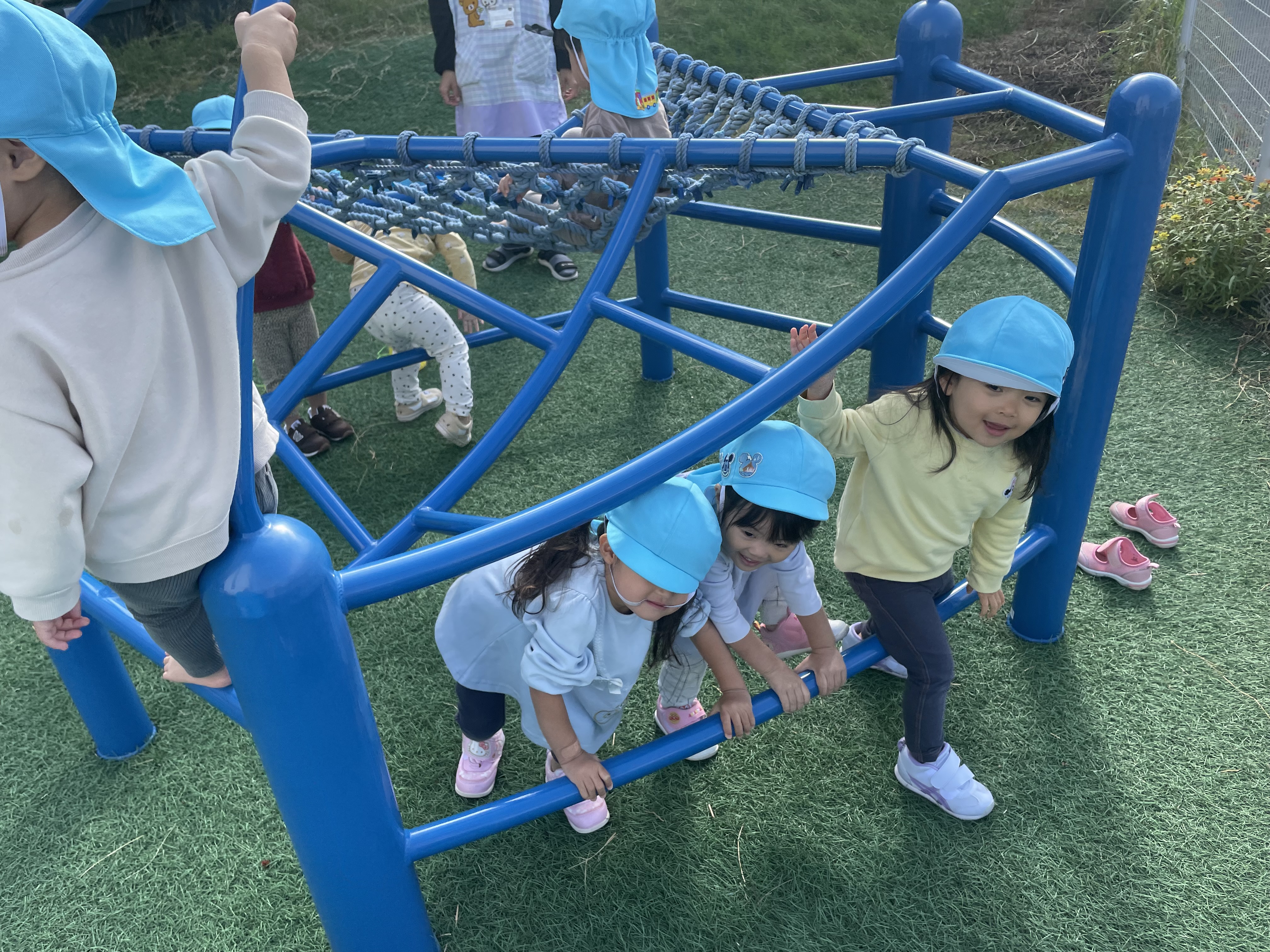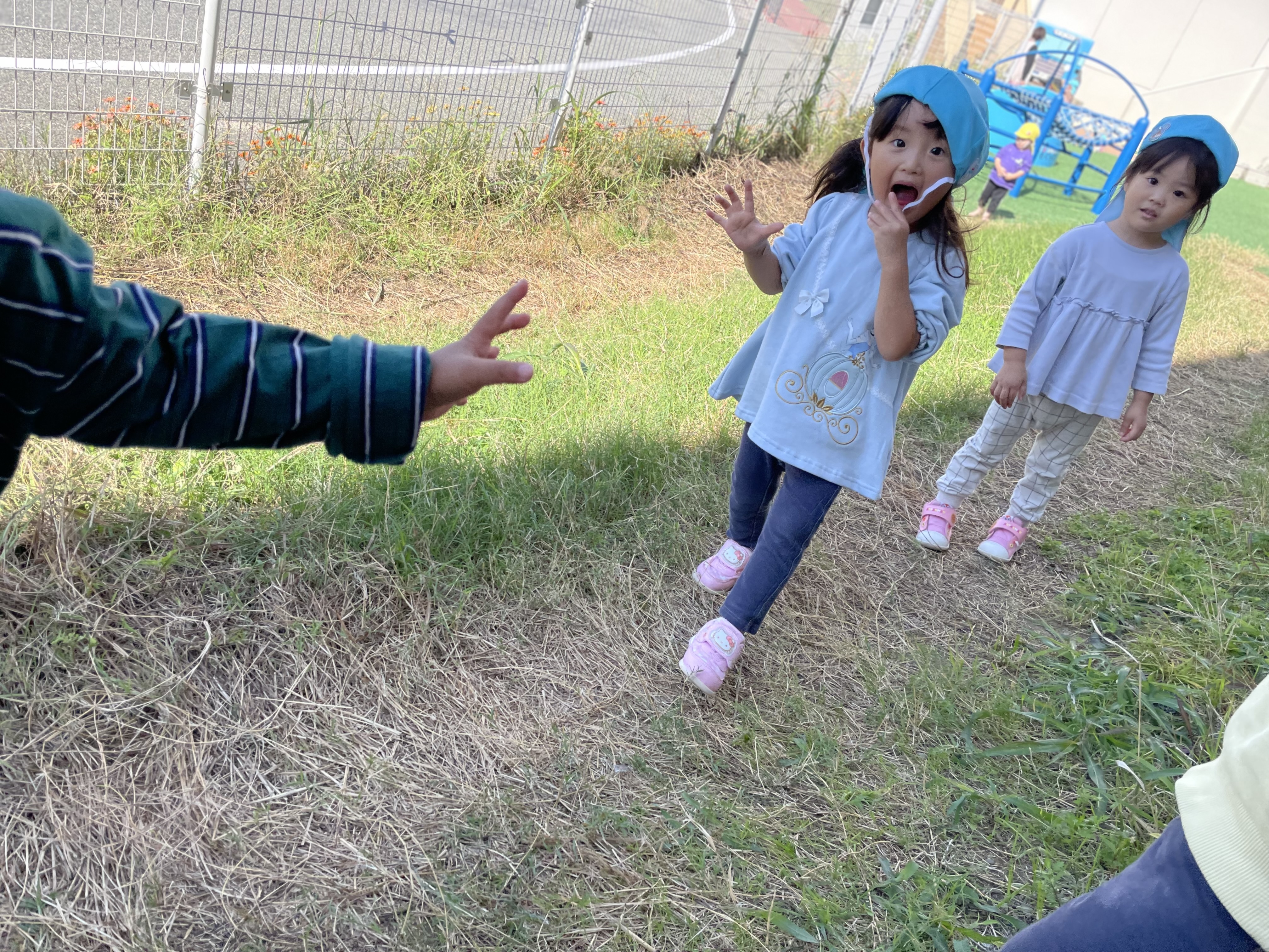 園庭では集団遊びの“トントントン何の音?”がブームで、ジャングルジムの中がお家の安全地帯です😊