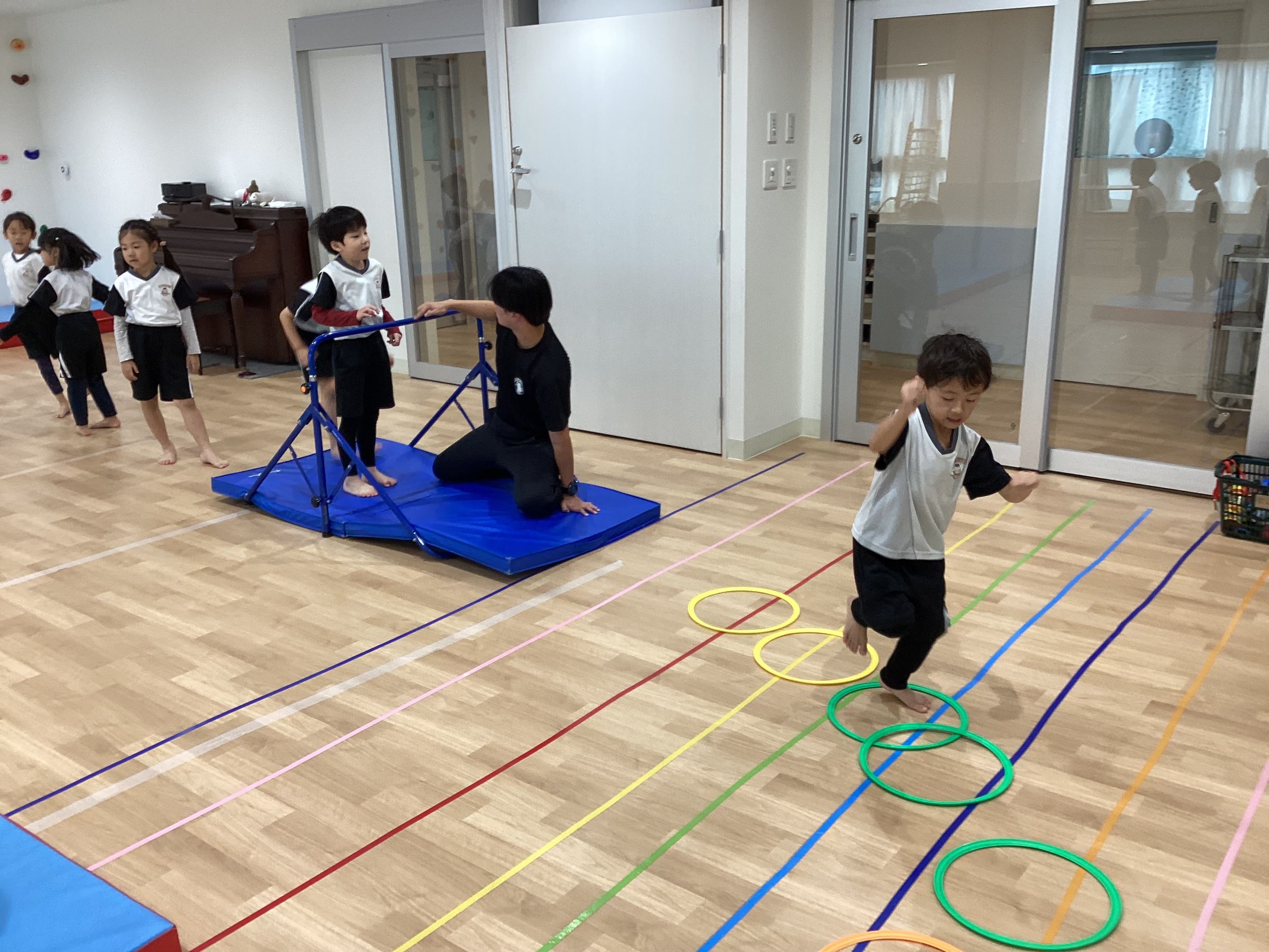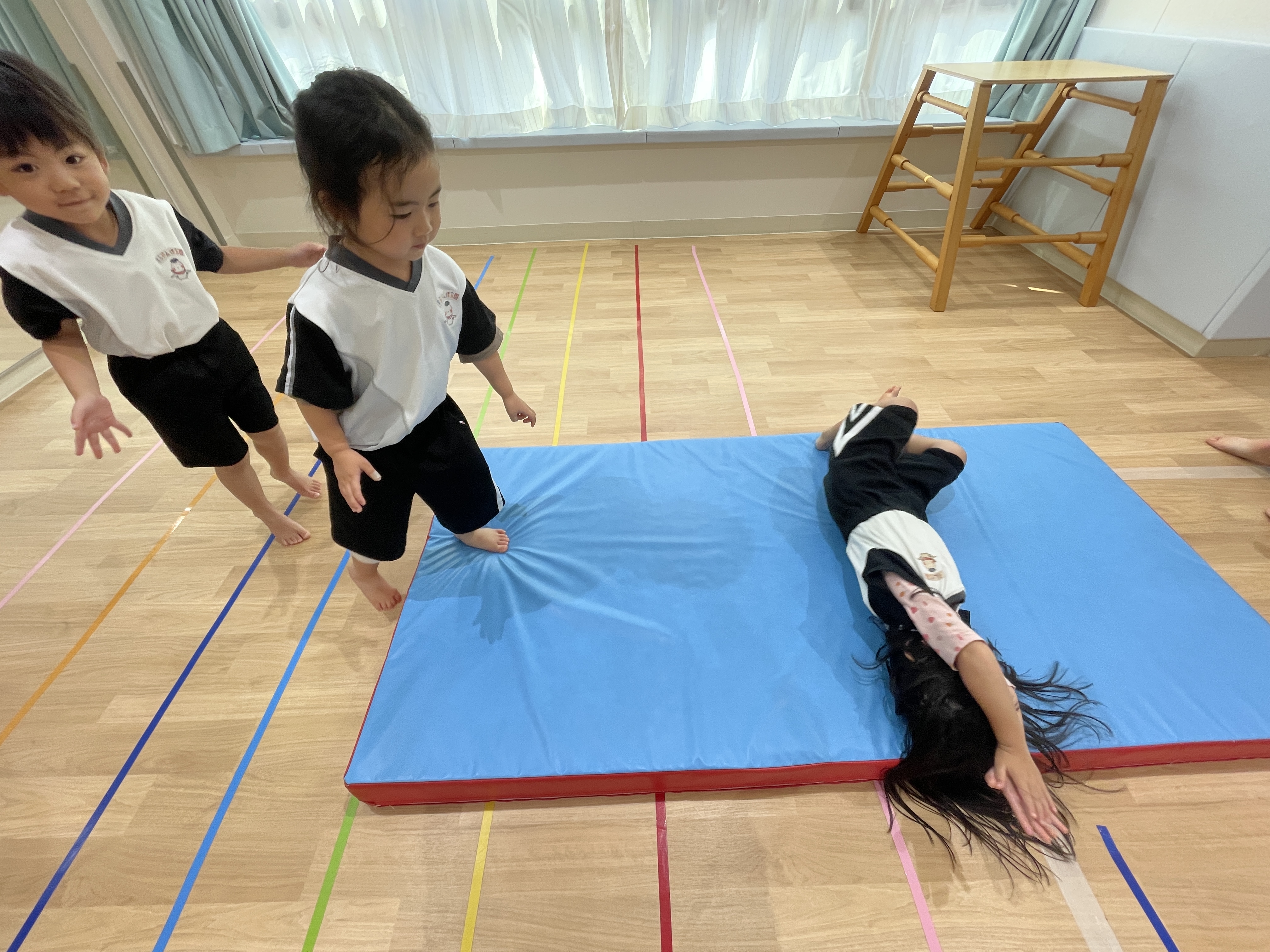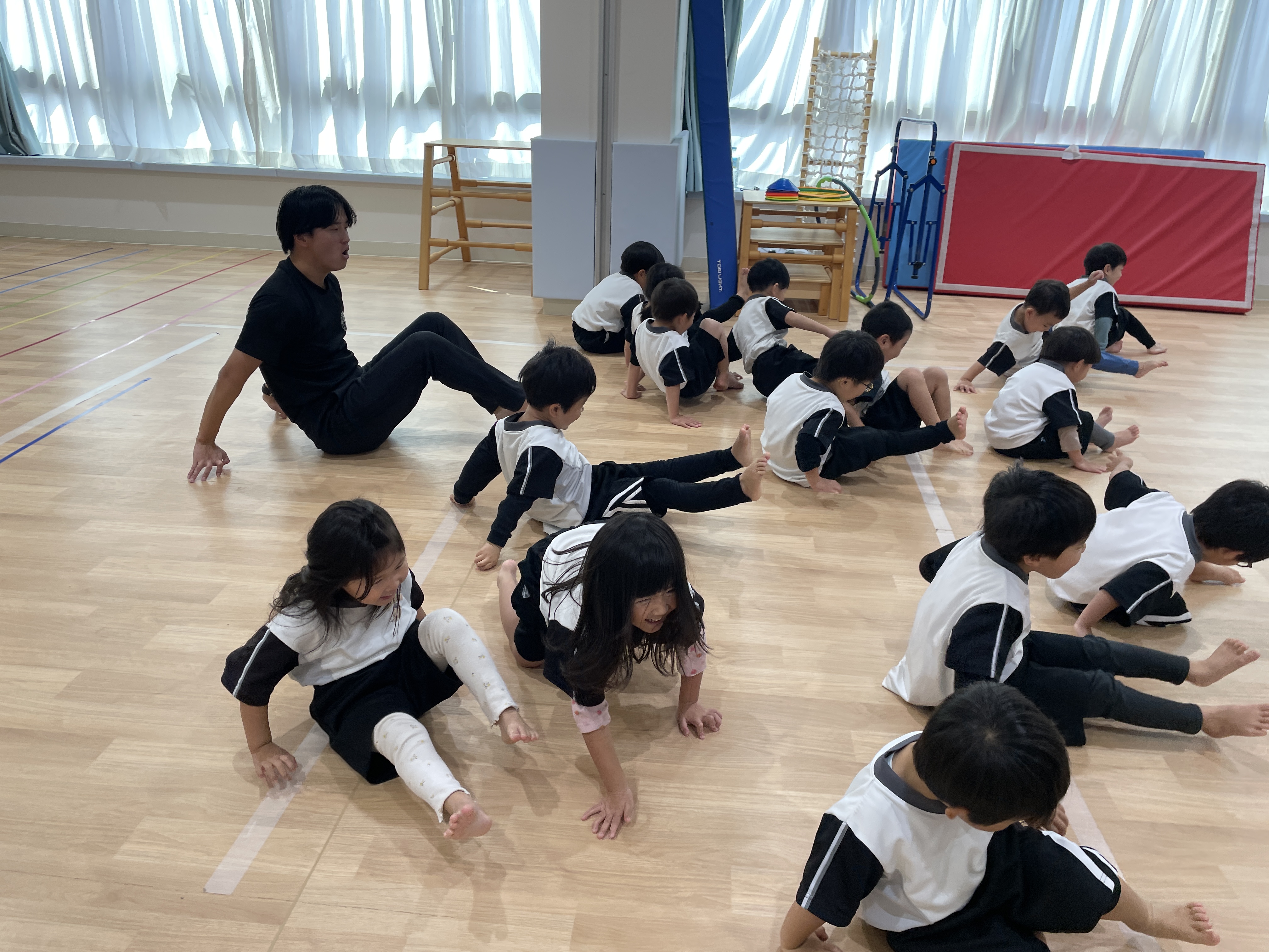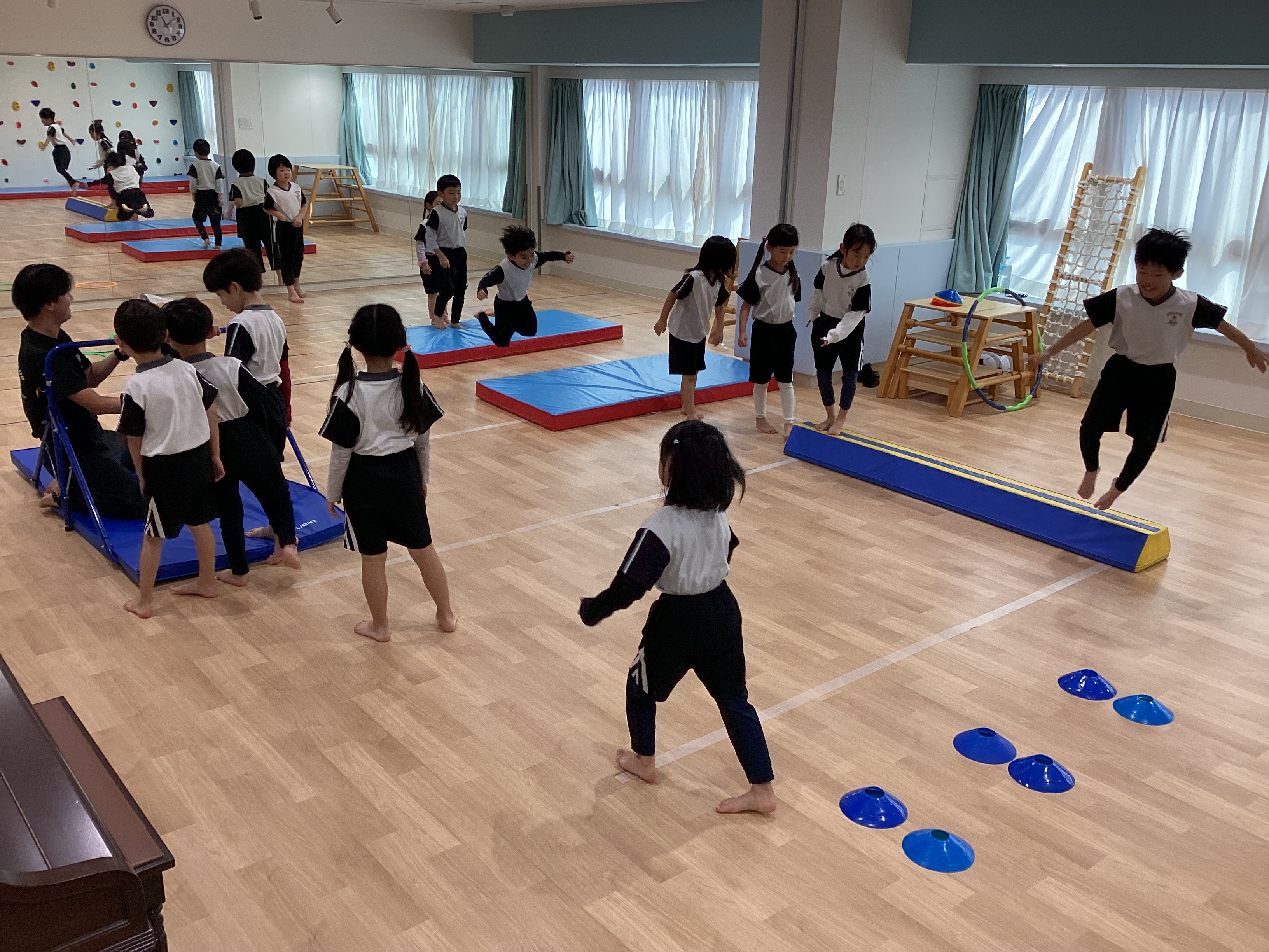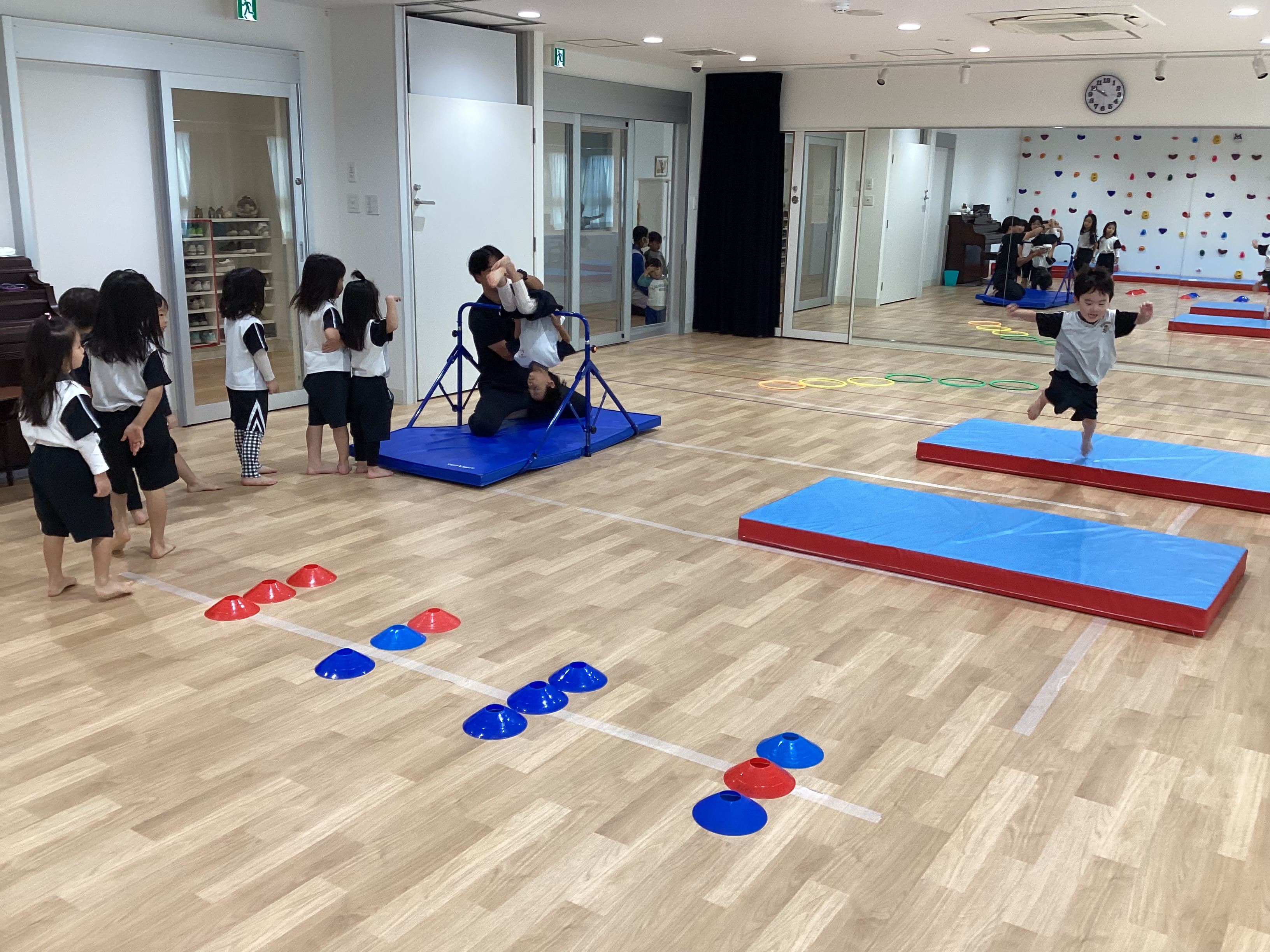 体操では、逆上がり、フープジャンプ、ジグザグジャンプ、橋渡り、サッカーなど様々な動きをして身体をおもいっきり動かして存分に楽しみましたよ😊みんな体操が大好きなようです💕