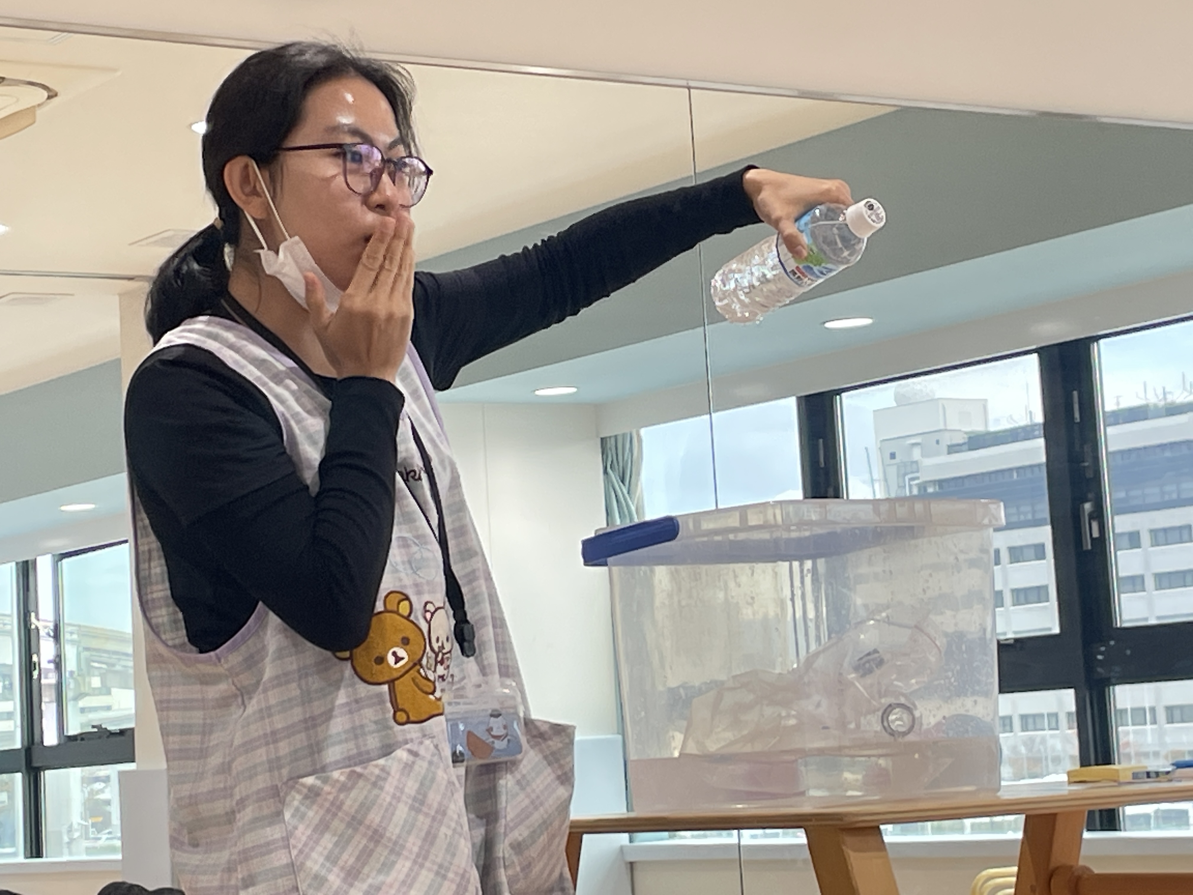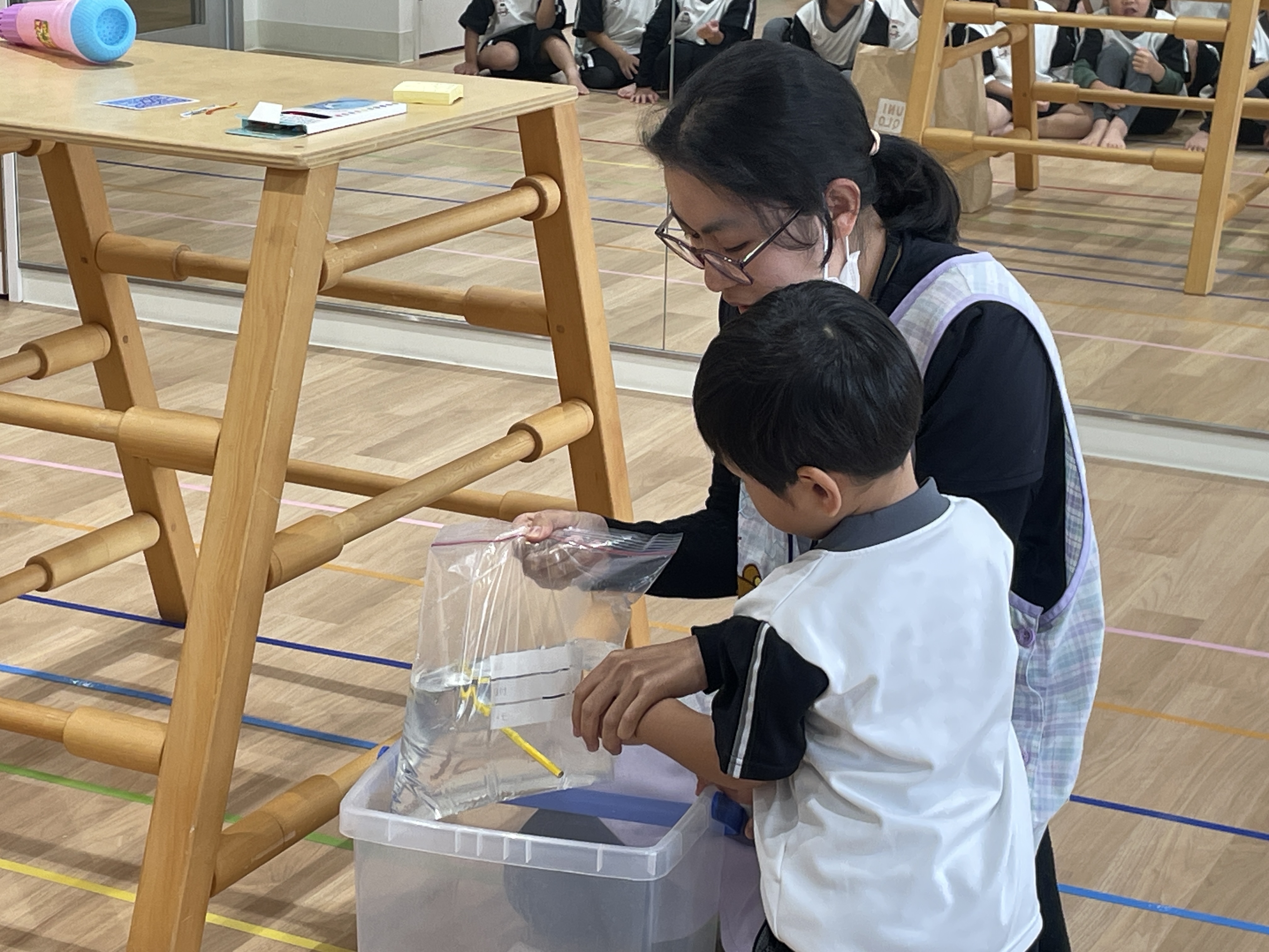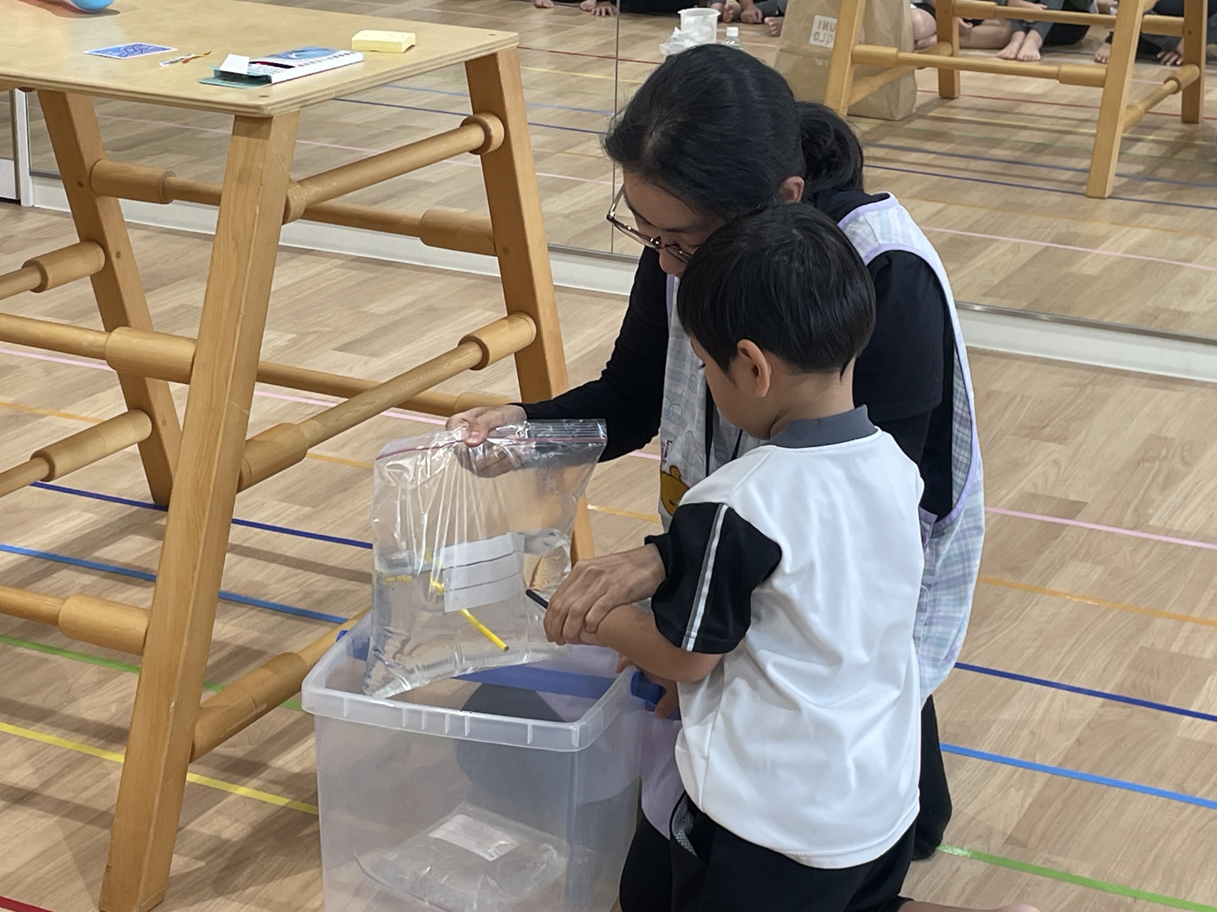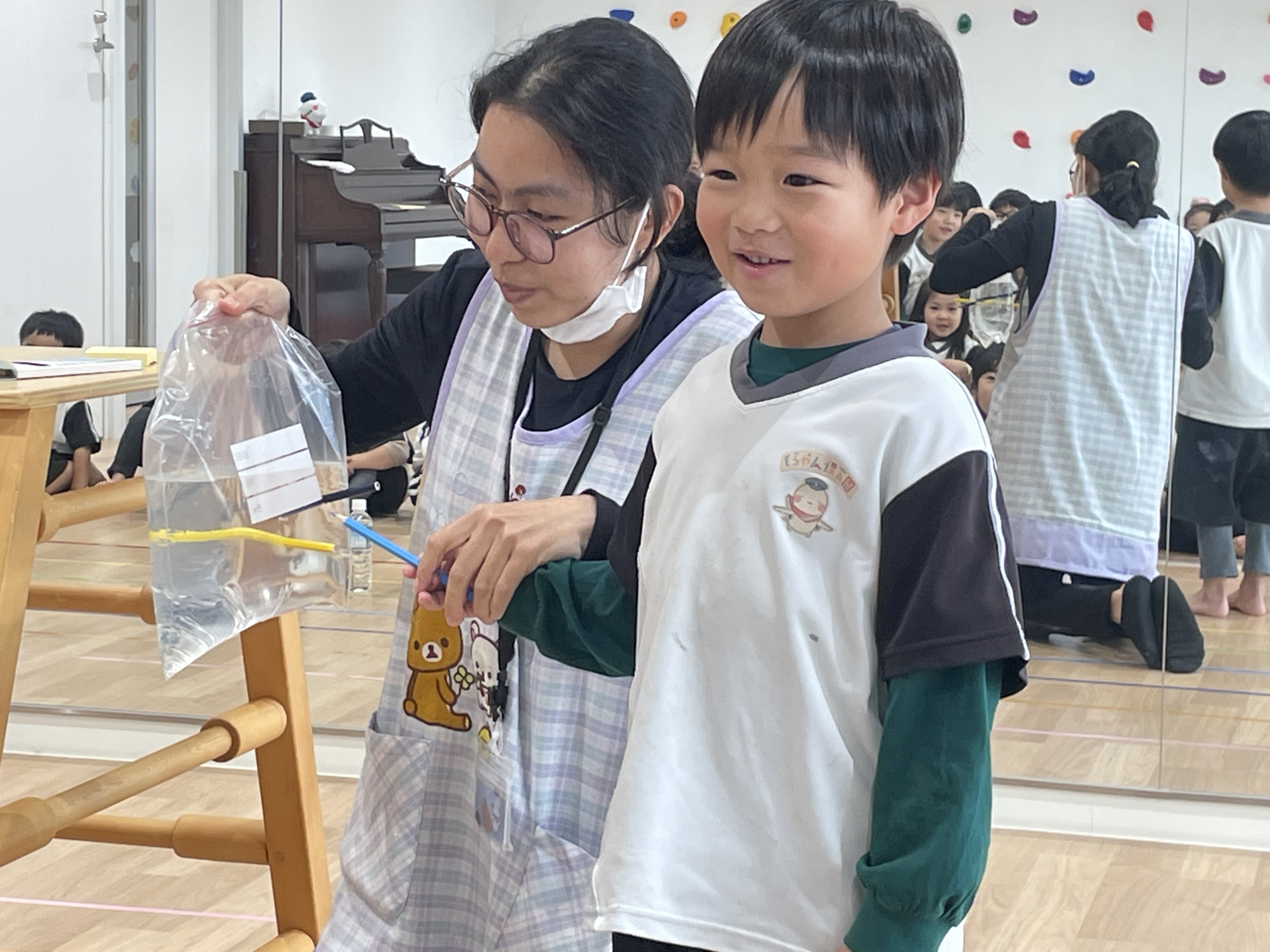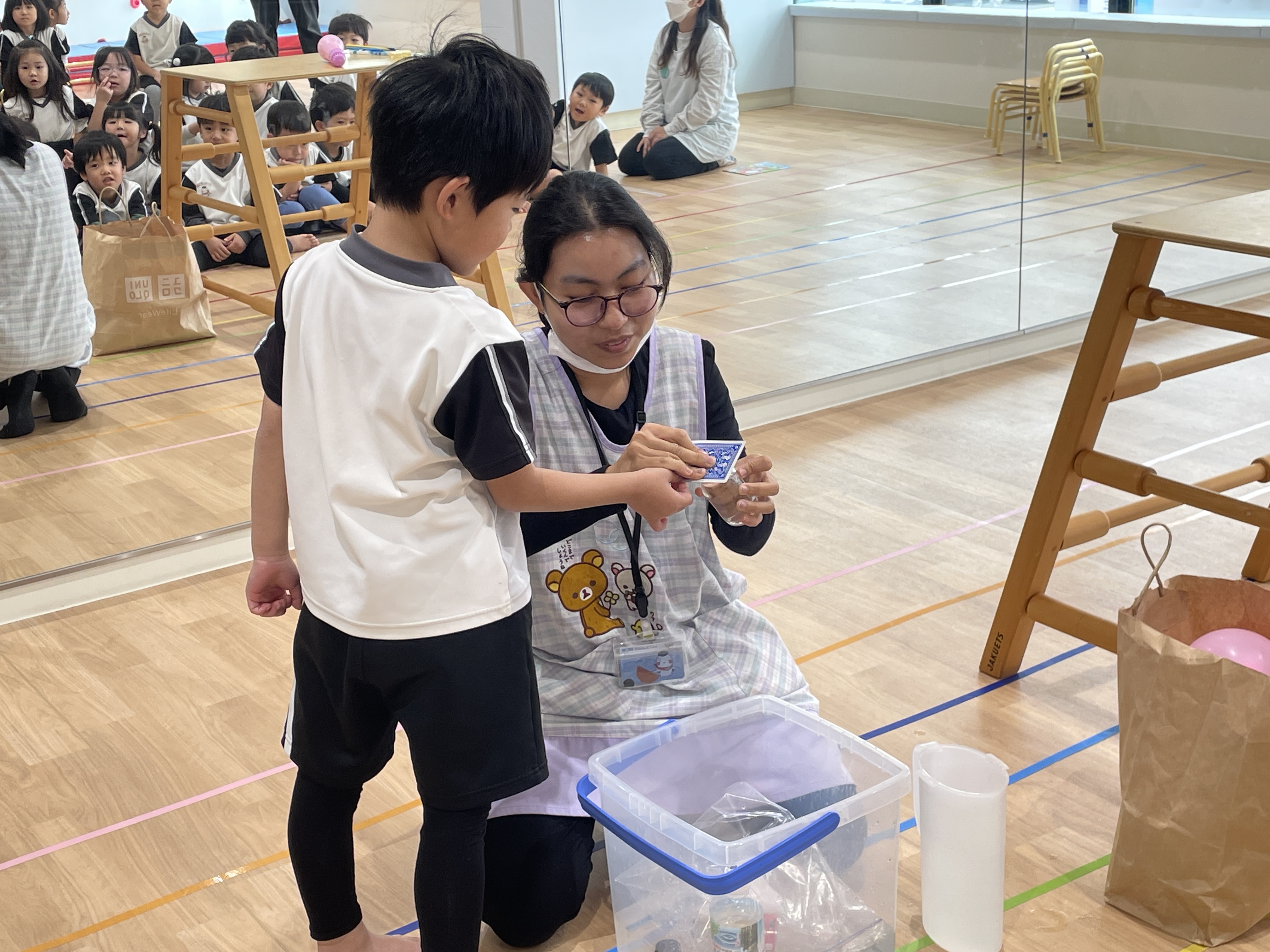 水の袋を色鉛筆でさしても水が出てこなかったり、水の色が変化したり、逆さにしても水が出なかったり、蓋を回すと水が少し吹き出たり、風船にはりをさしても割れなかったりするマジックでした👏
