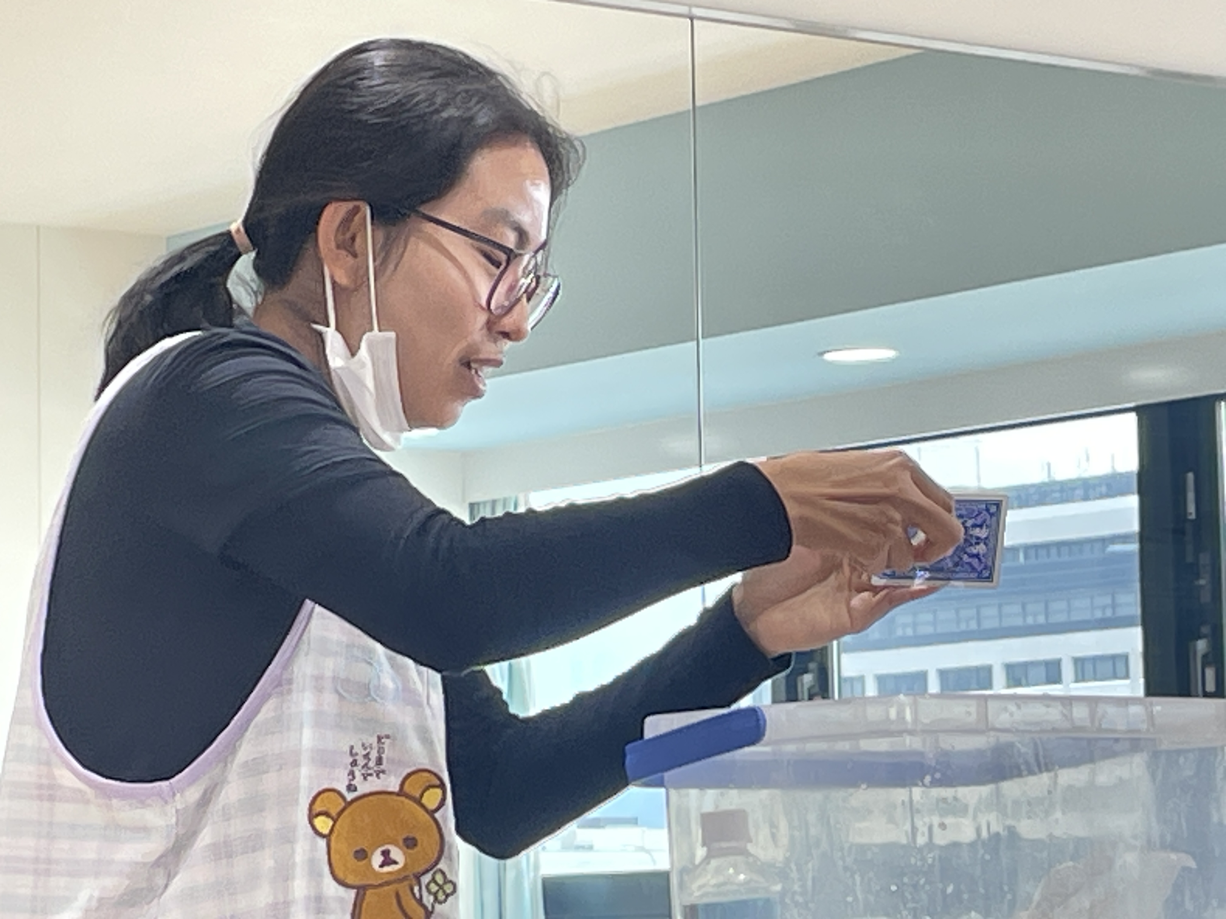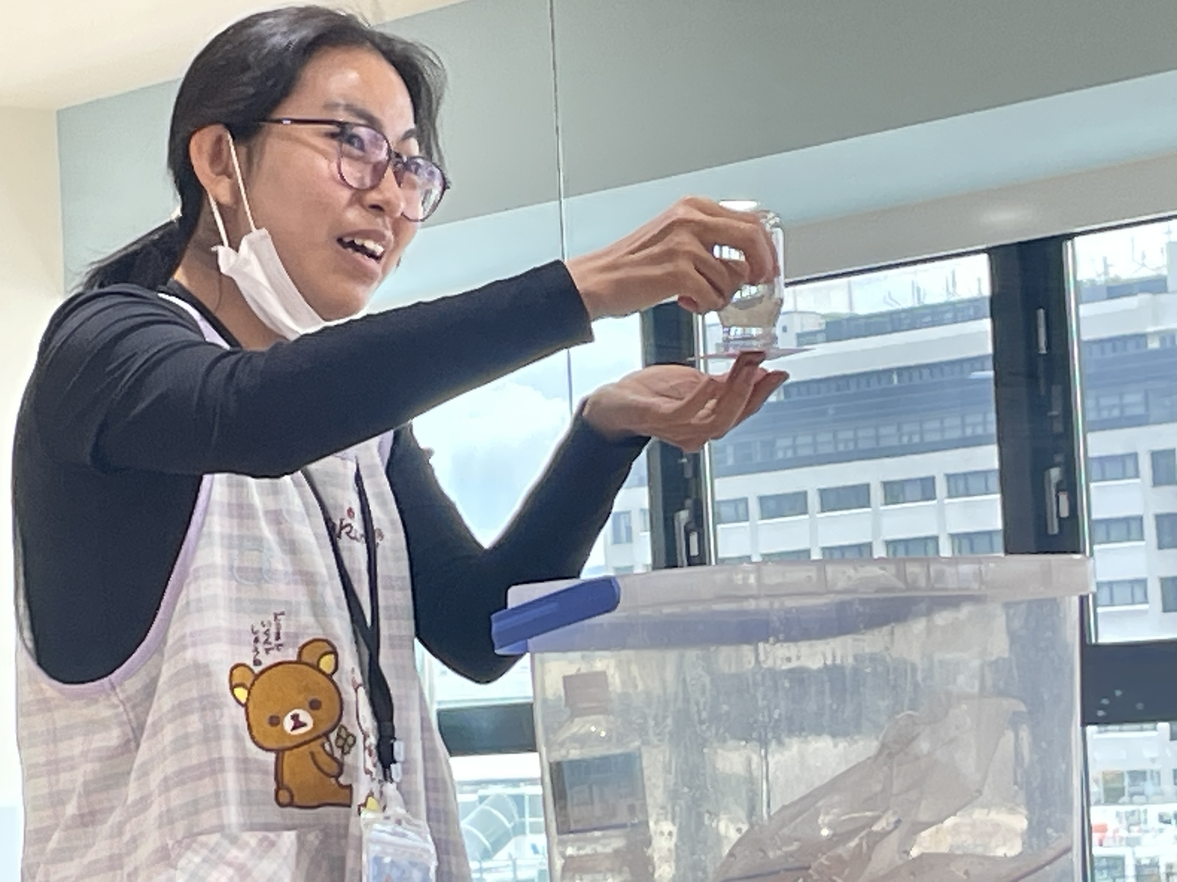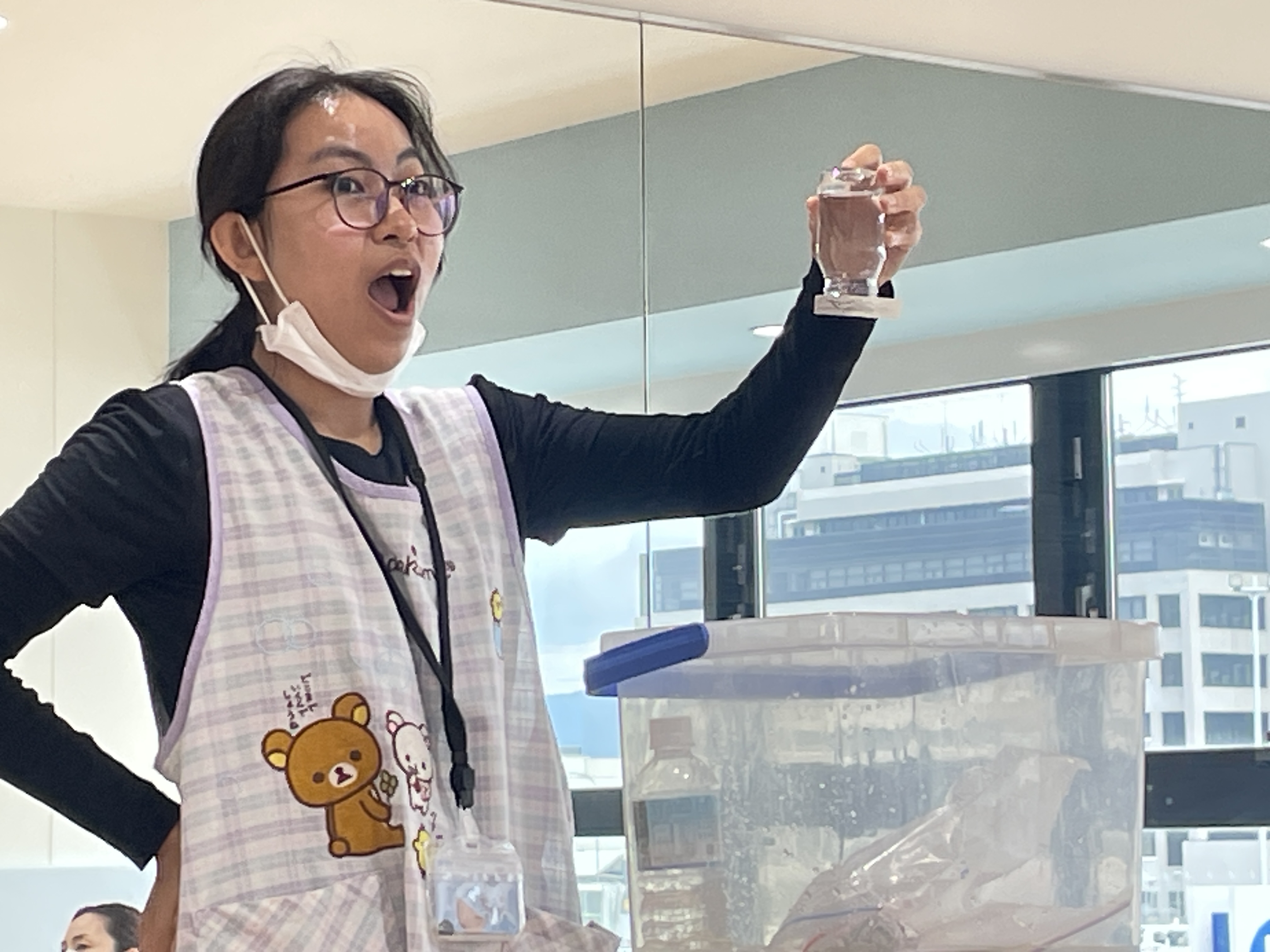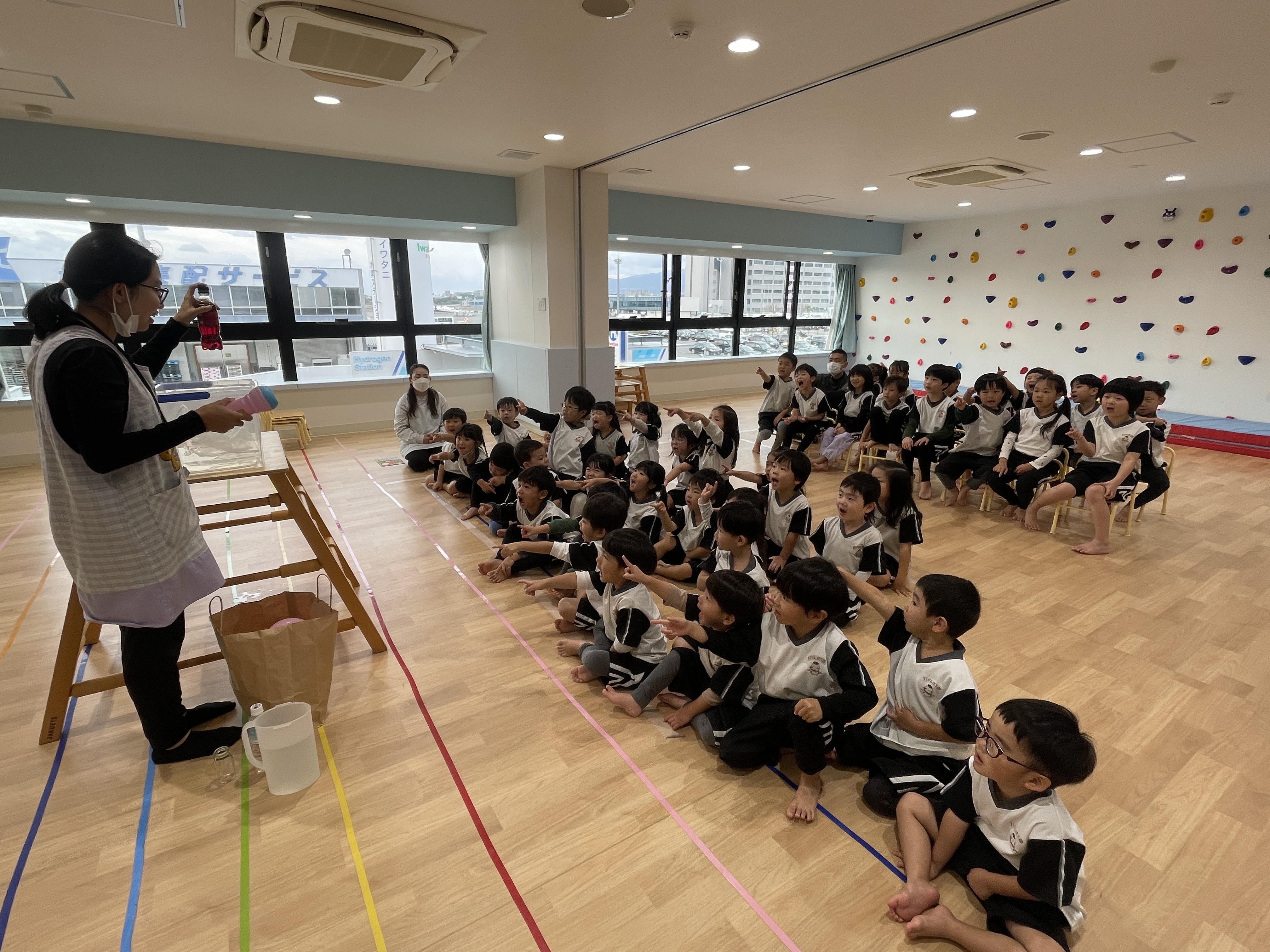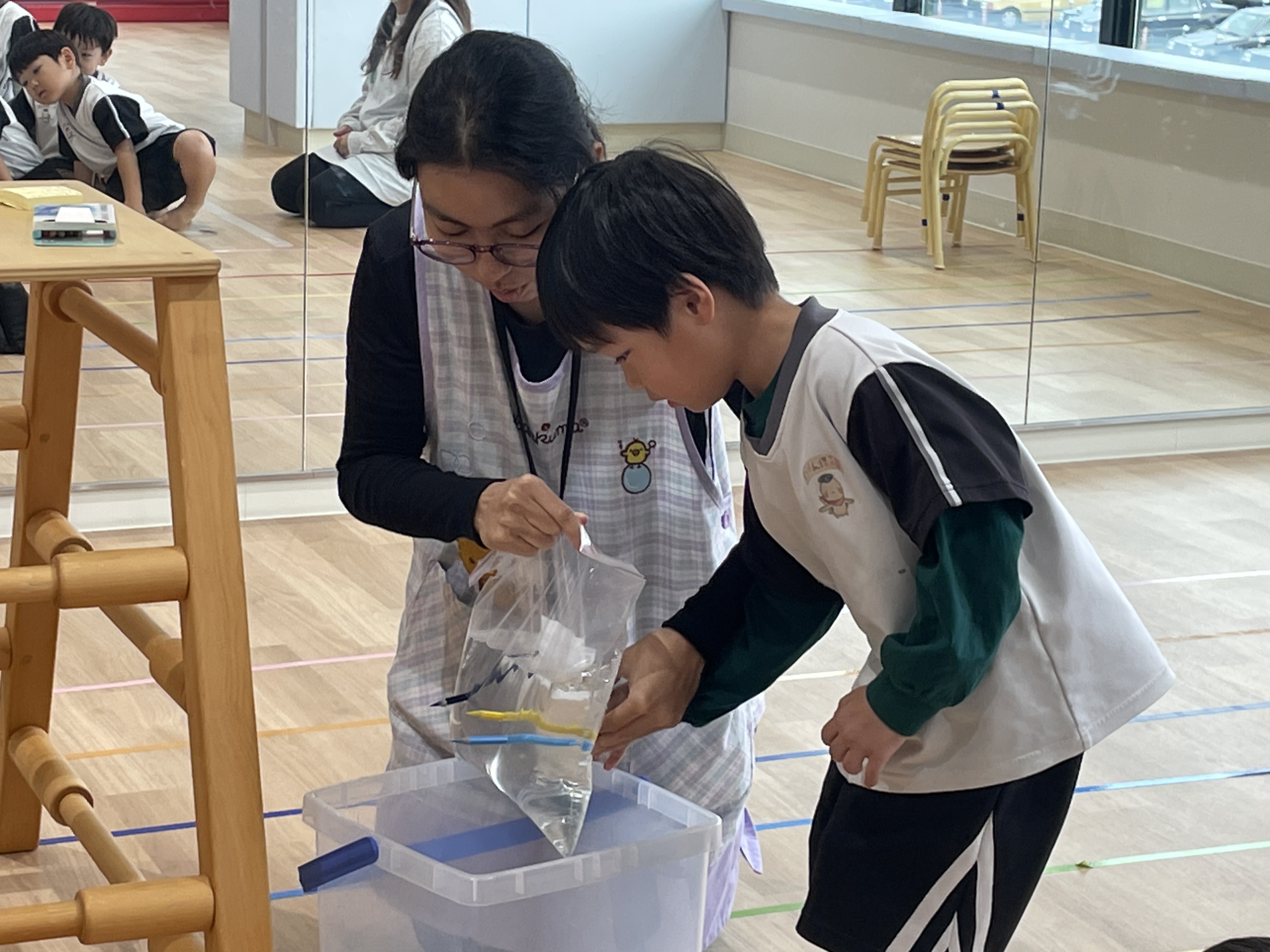 水の袋を色鉛筆でさしても水が出てこなかったり、水の色が変化したり、逆さにしても水が出なかったり、蓋を回すと水が少し吹き出たり、風船にはりをさしても割れなかったりするマジックでした👏