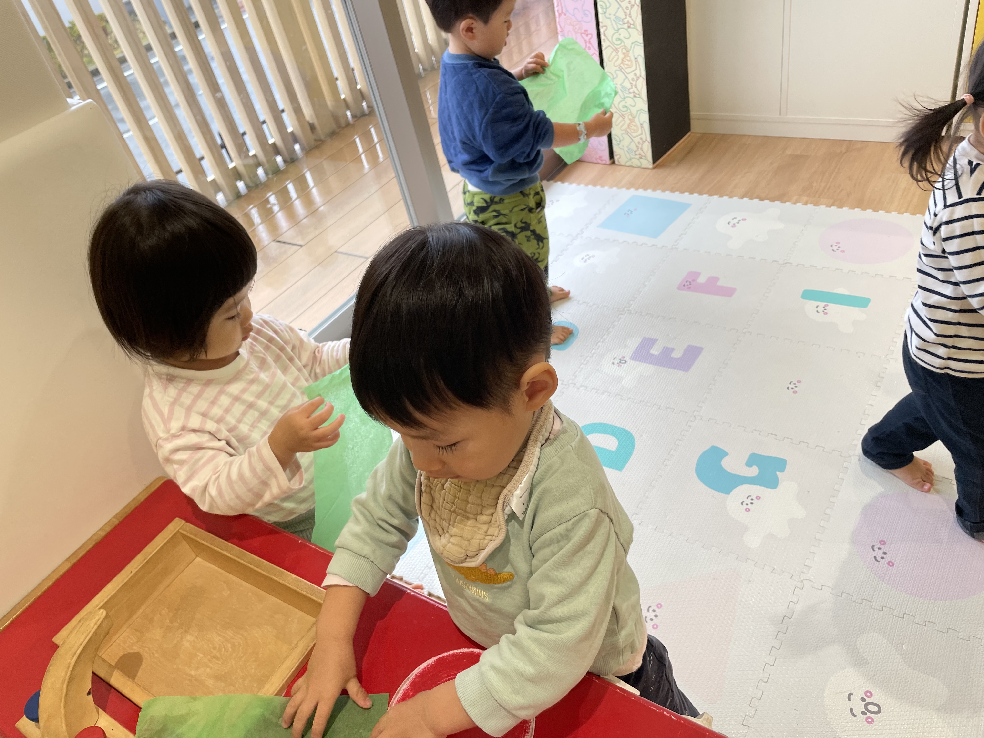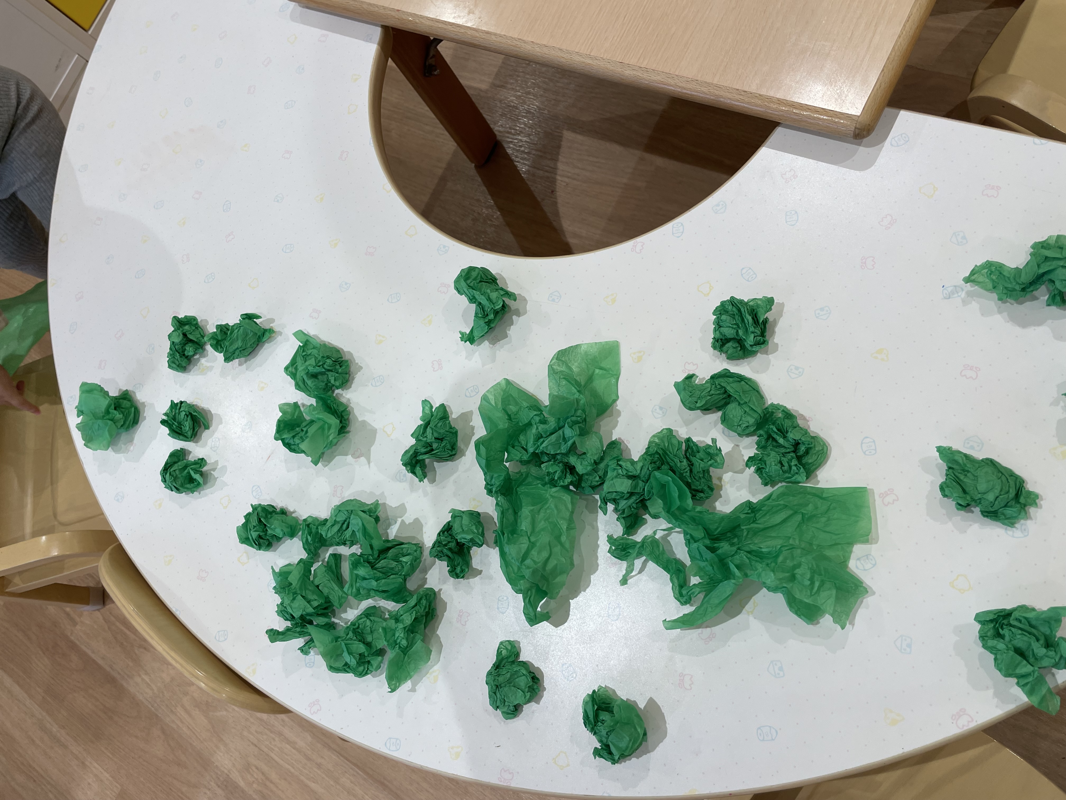 そしてクリスマスのリース製作へ!!みんなでお花紙をしゃくしゃと丸くしたよ!
