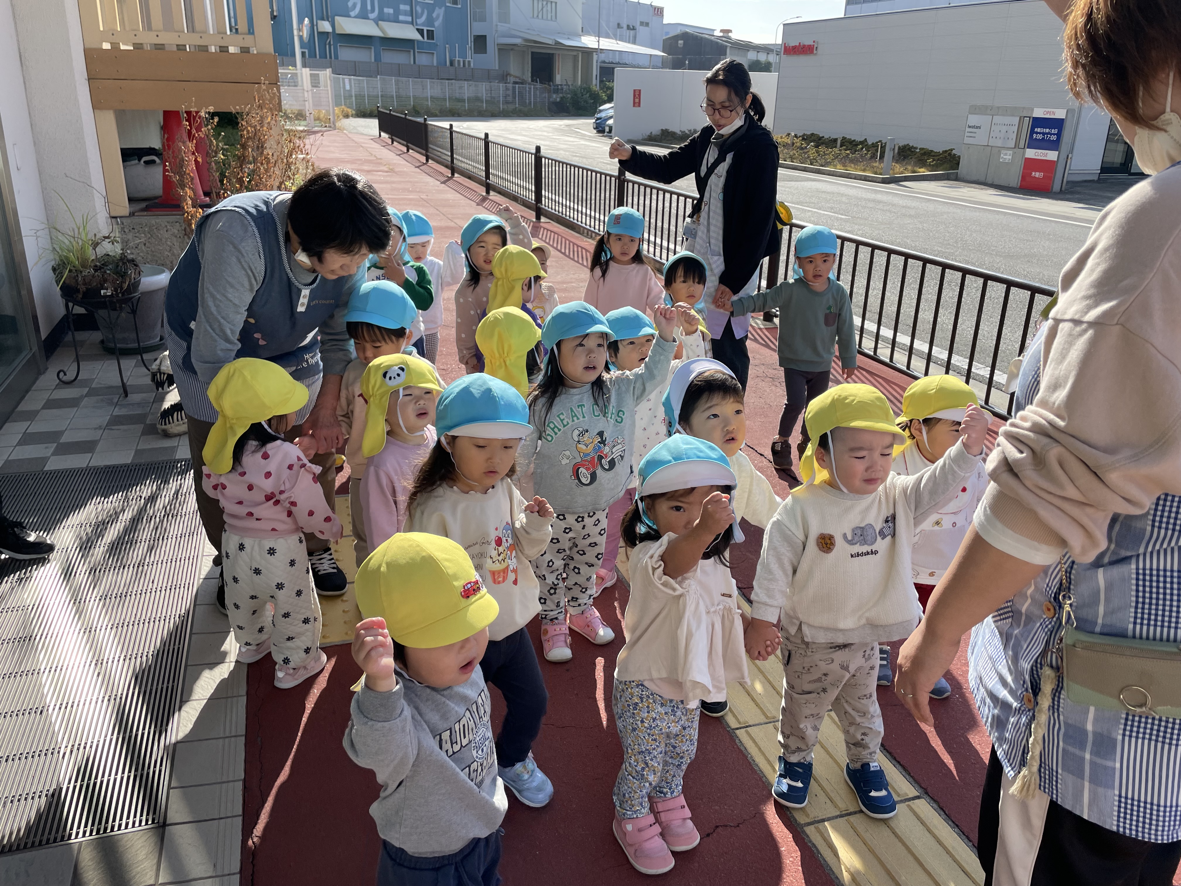 今日はひかり組さんはれ組さんと一緒にお散歩に行きました!行き先は…蛍池小学校!