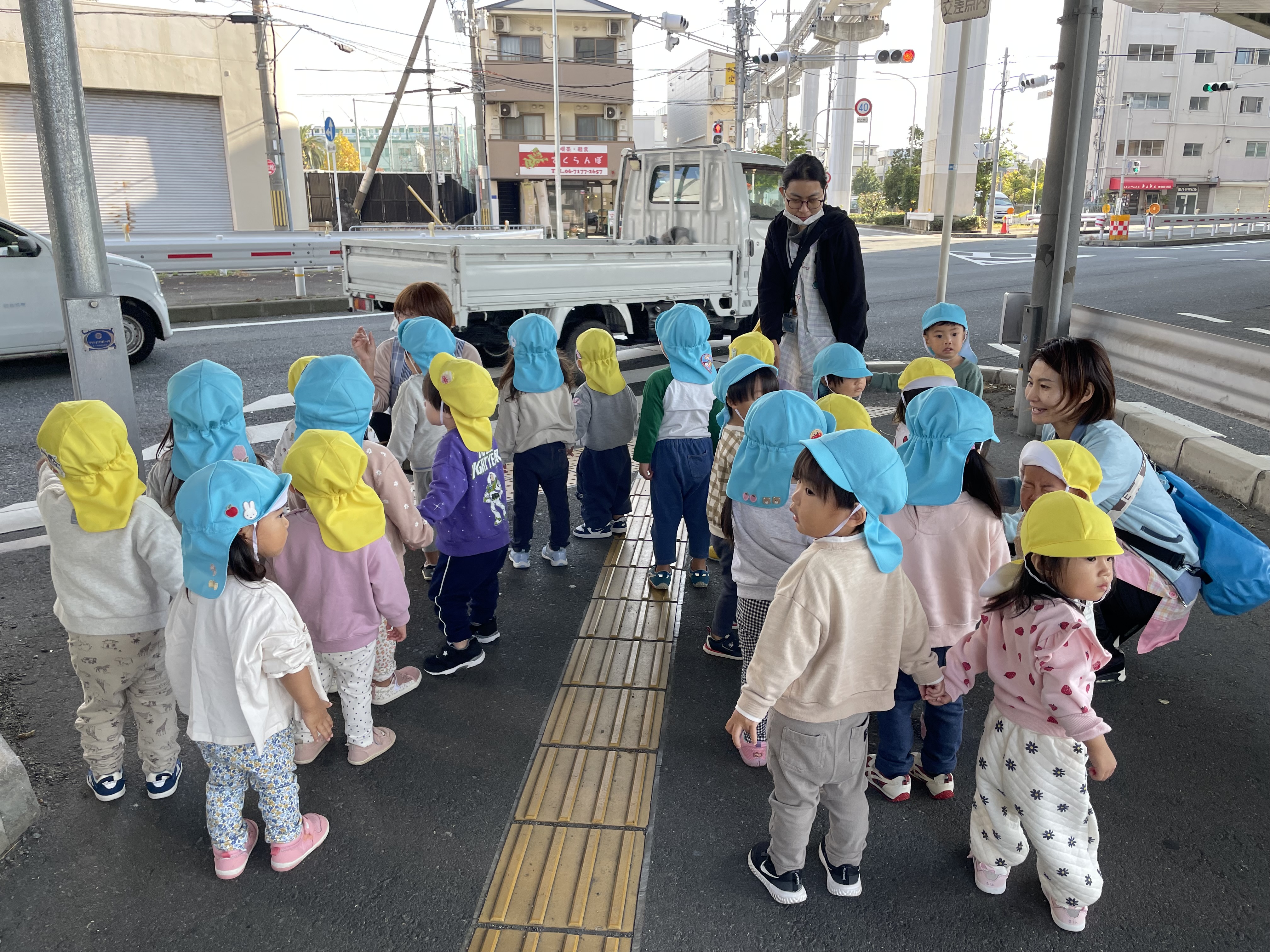 何度か通ったことはありますが、みんなで歩いて渡るのは初めての大通りの信号🚥ドキドキですが、2歳さんが優しく手を引いてくれました♪
