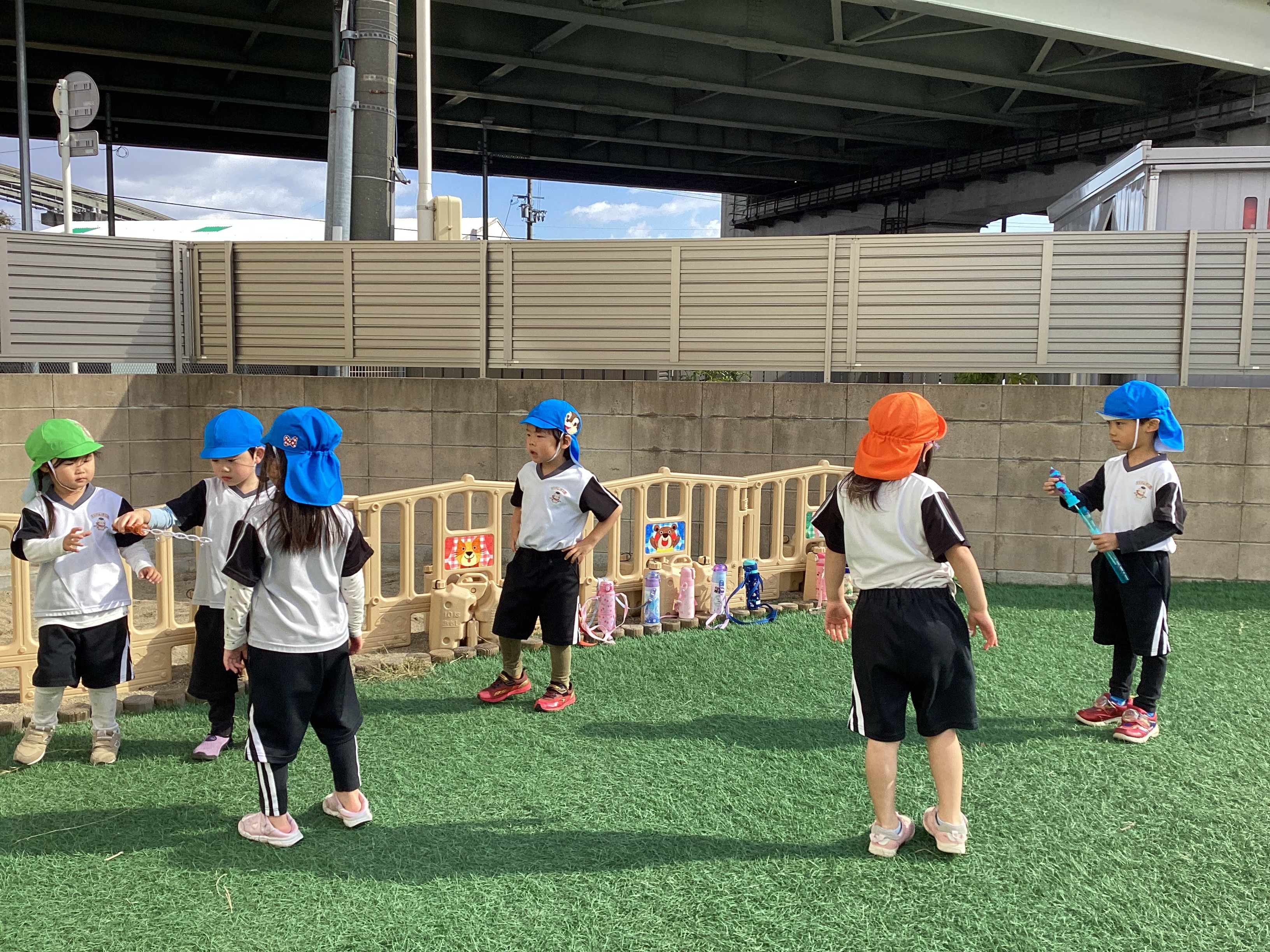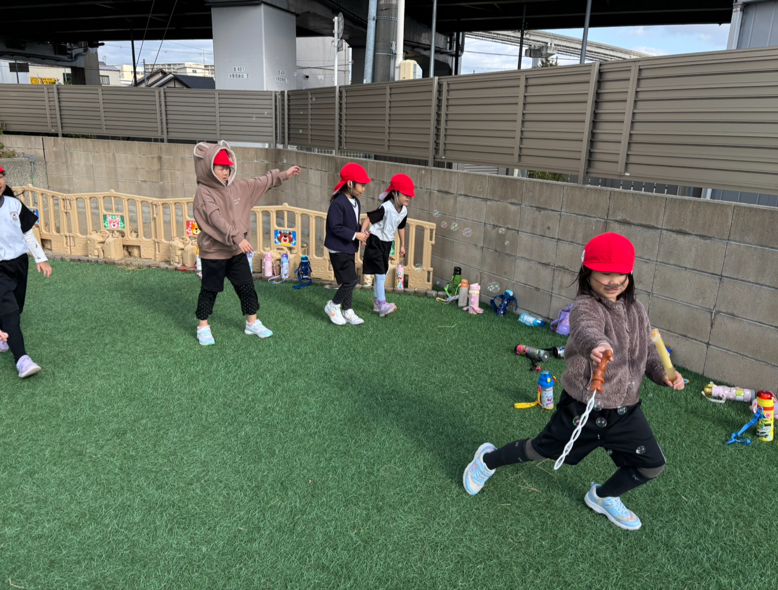 戸外では、シャボン玉遊びに夢中のそら組のみんなでしたよ。また遊びましょうね💖