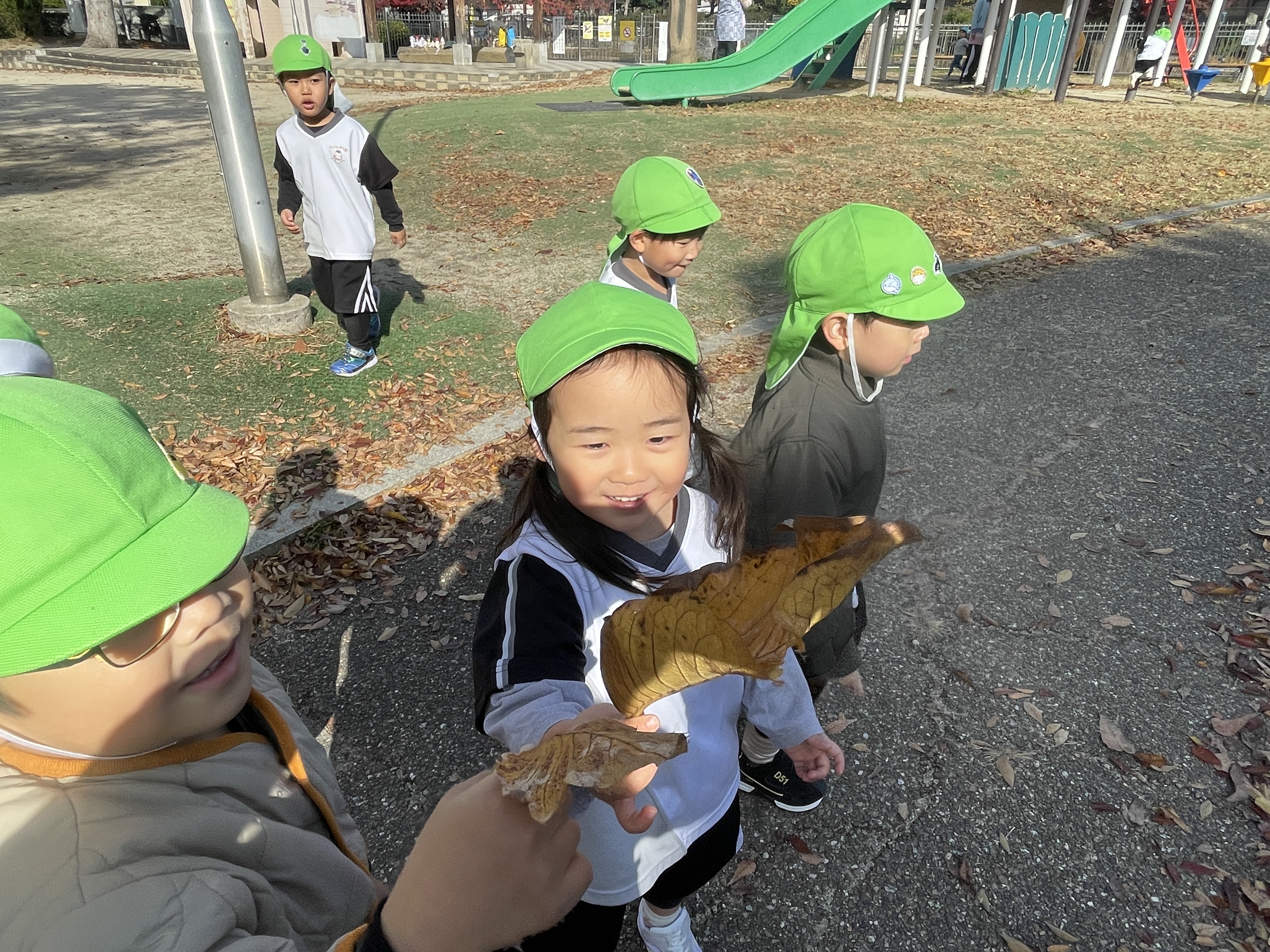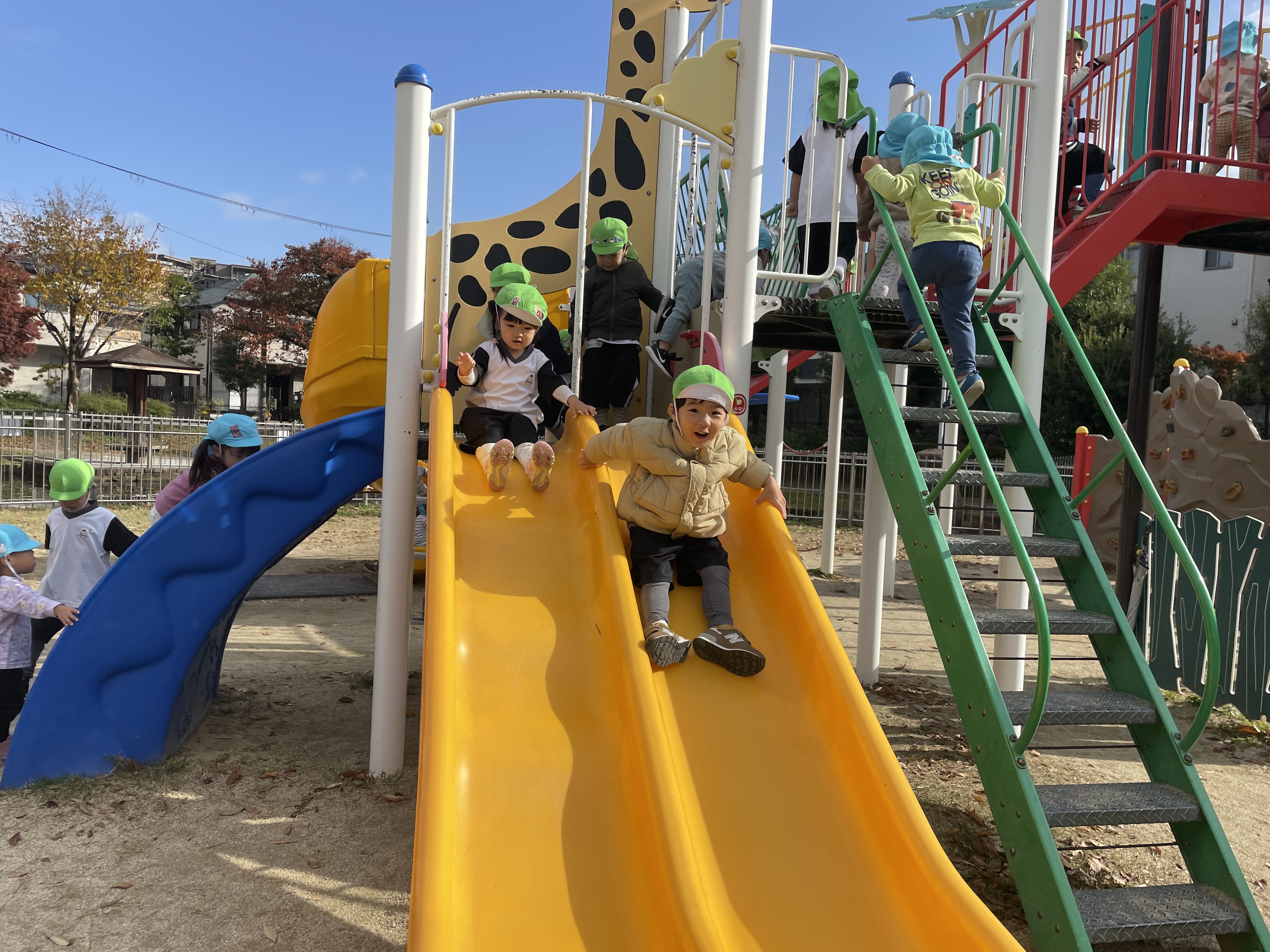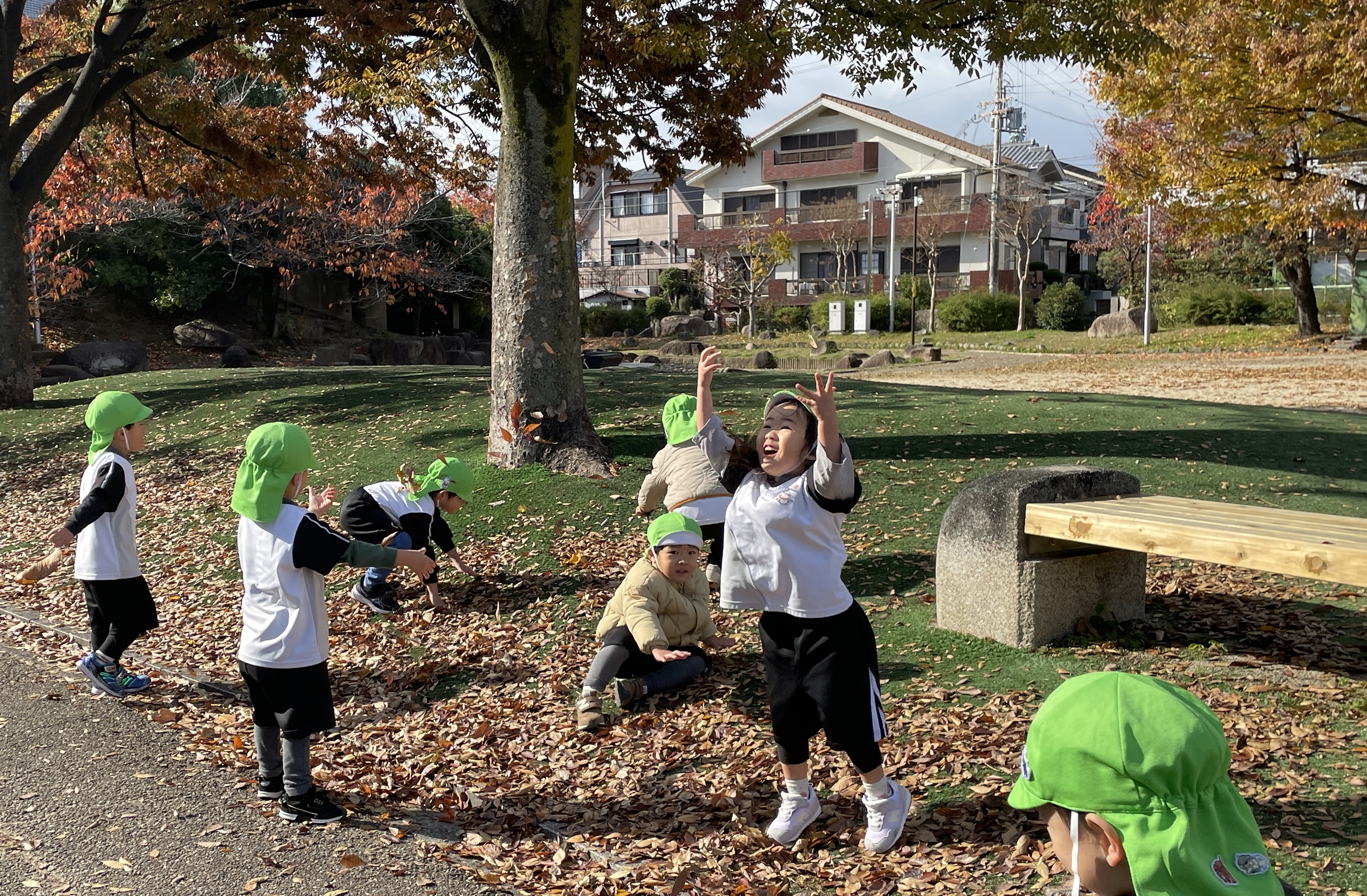 滑り台やアスレチックなど遊具を満喫したあとは落ち葉🍂をふんでカサカサ鳴る音を楽しんだり、紙吹雪のように頭からふらせてみたり、、大きい葉っぱや赤、黄色などいろいろな発見を楽しみながら遊んでいましたよ😊