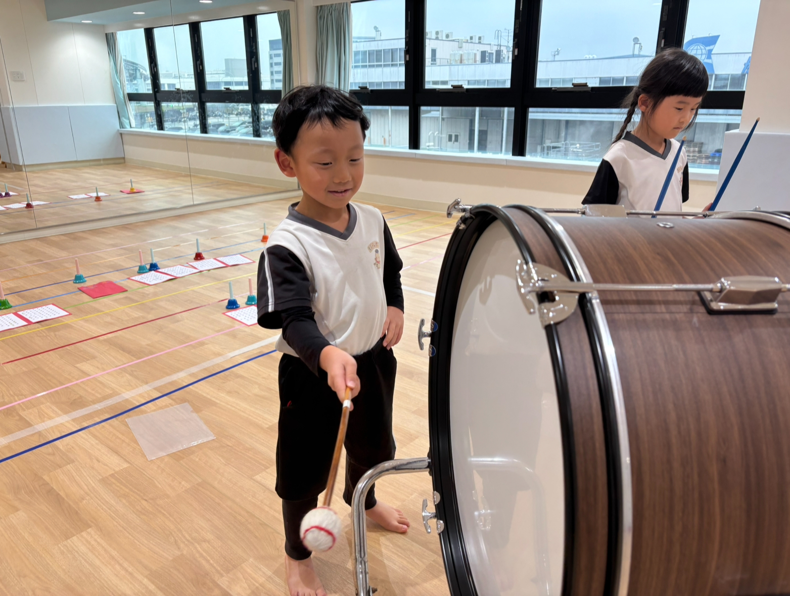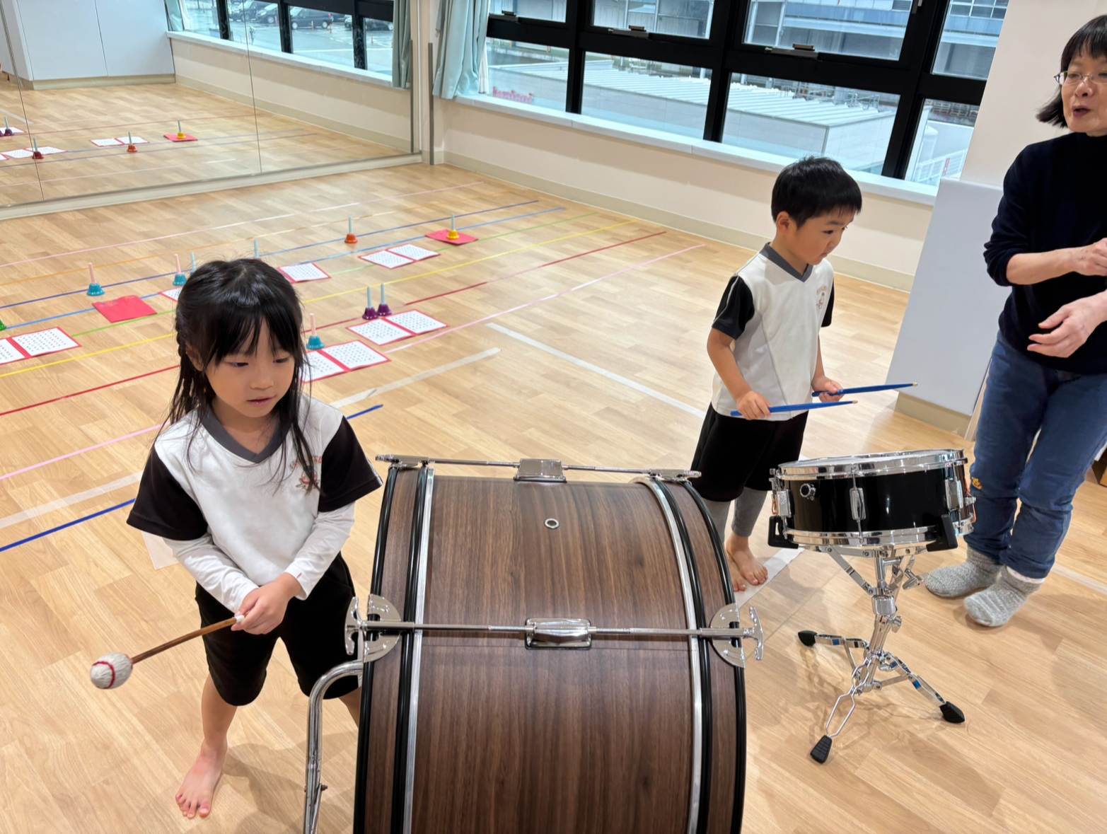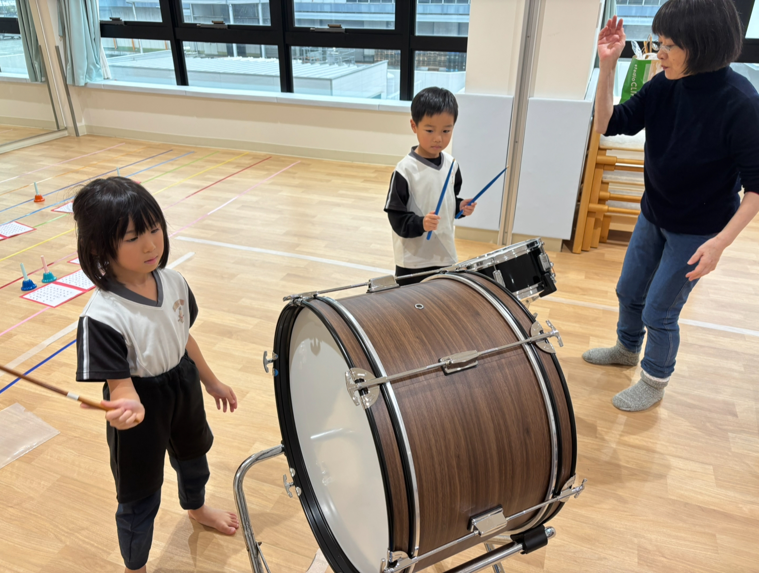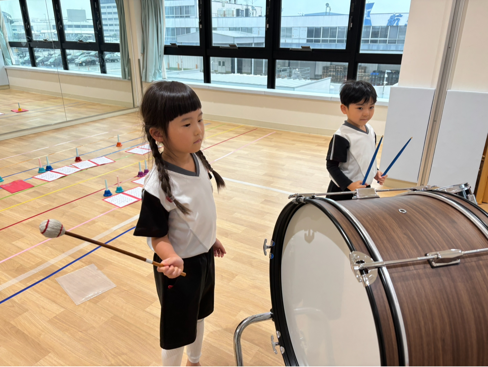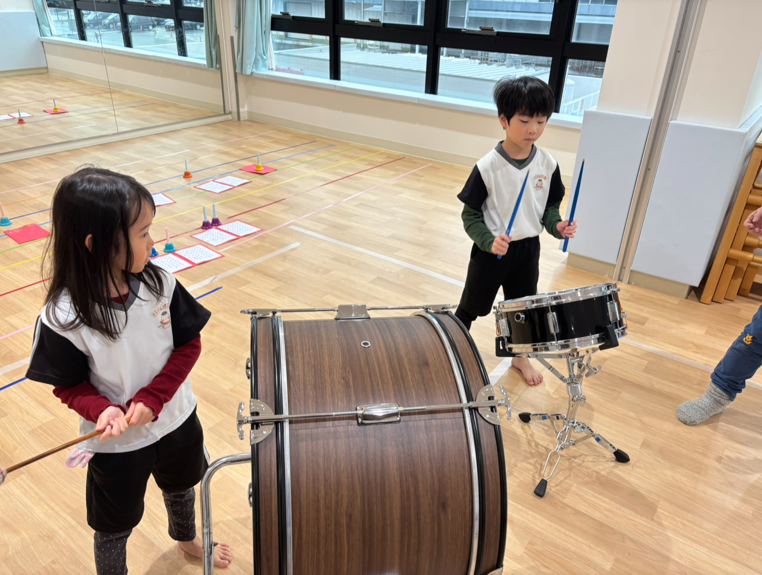 今週の音楽遊びでは、ハンドベルの後に大太鼓と小太鼓をしました。