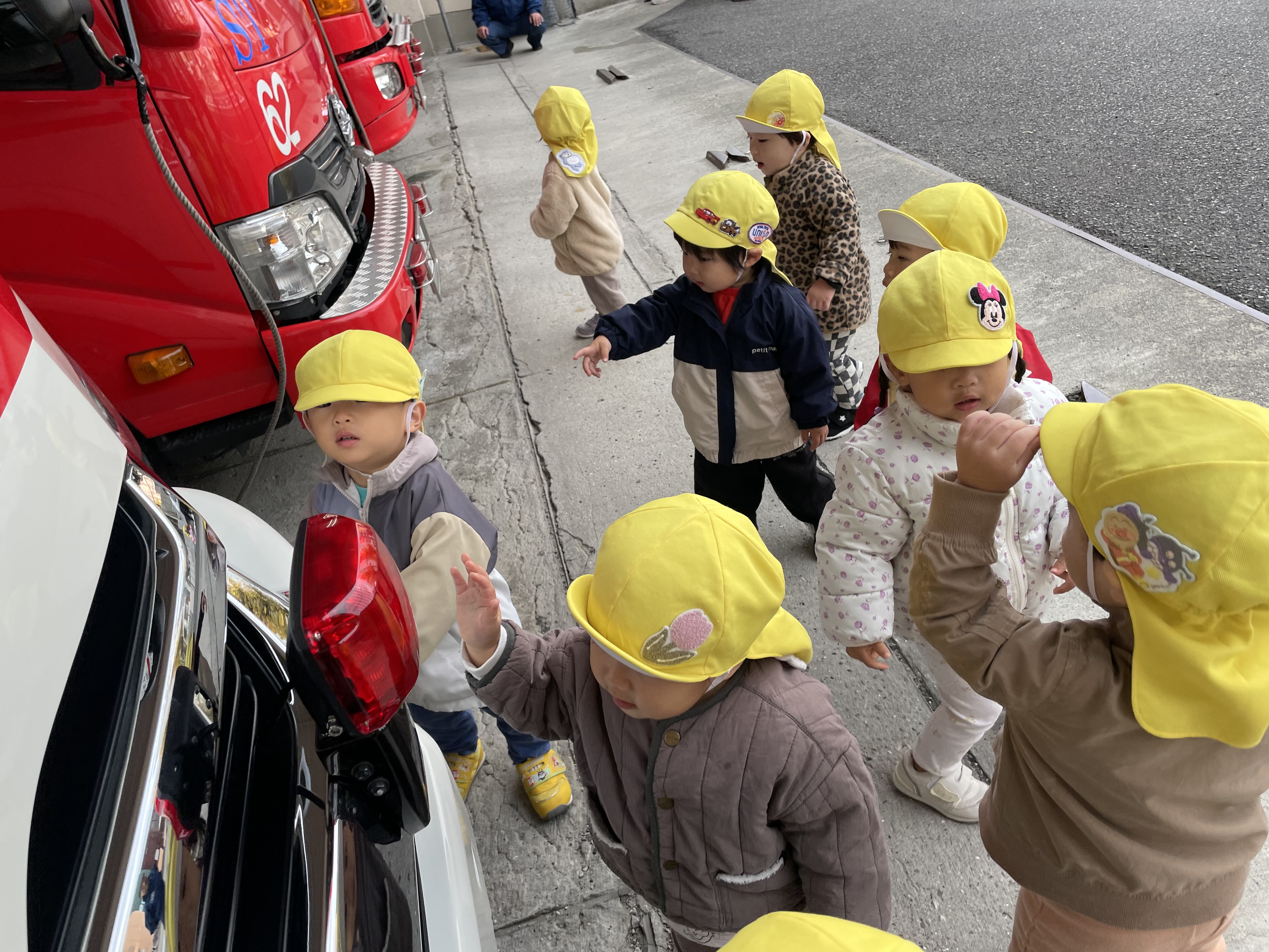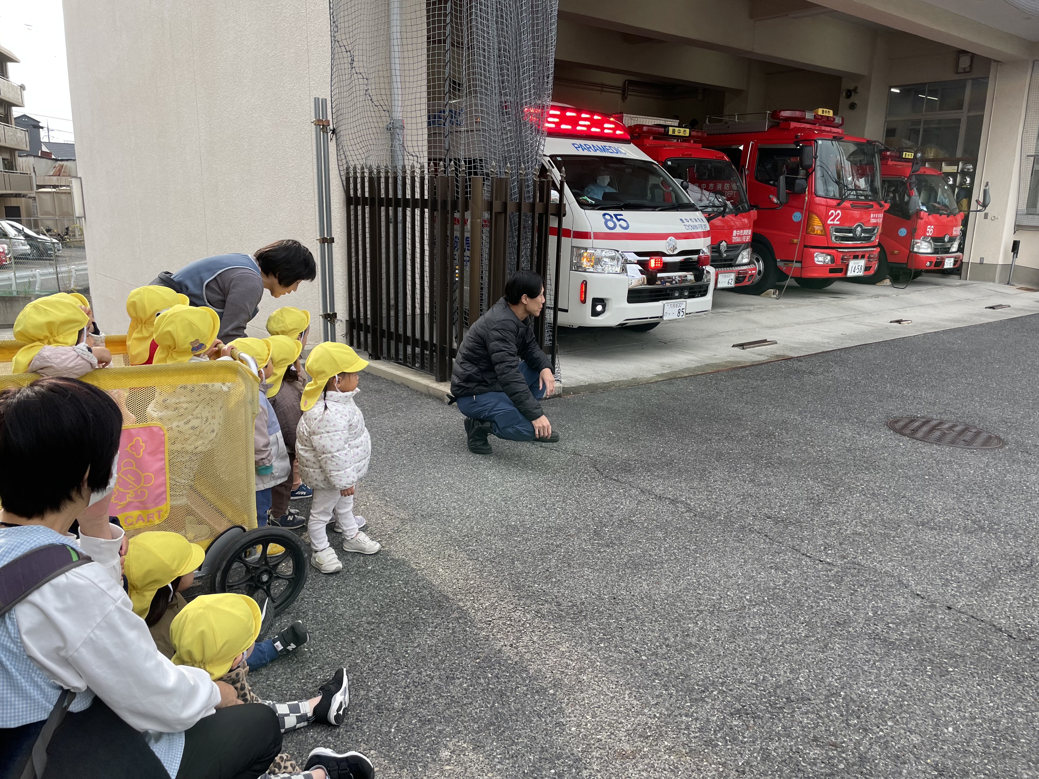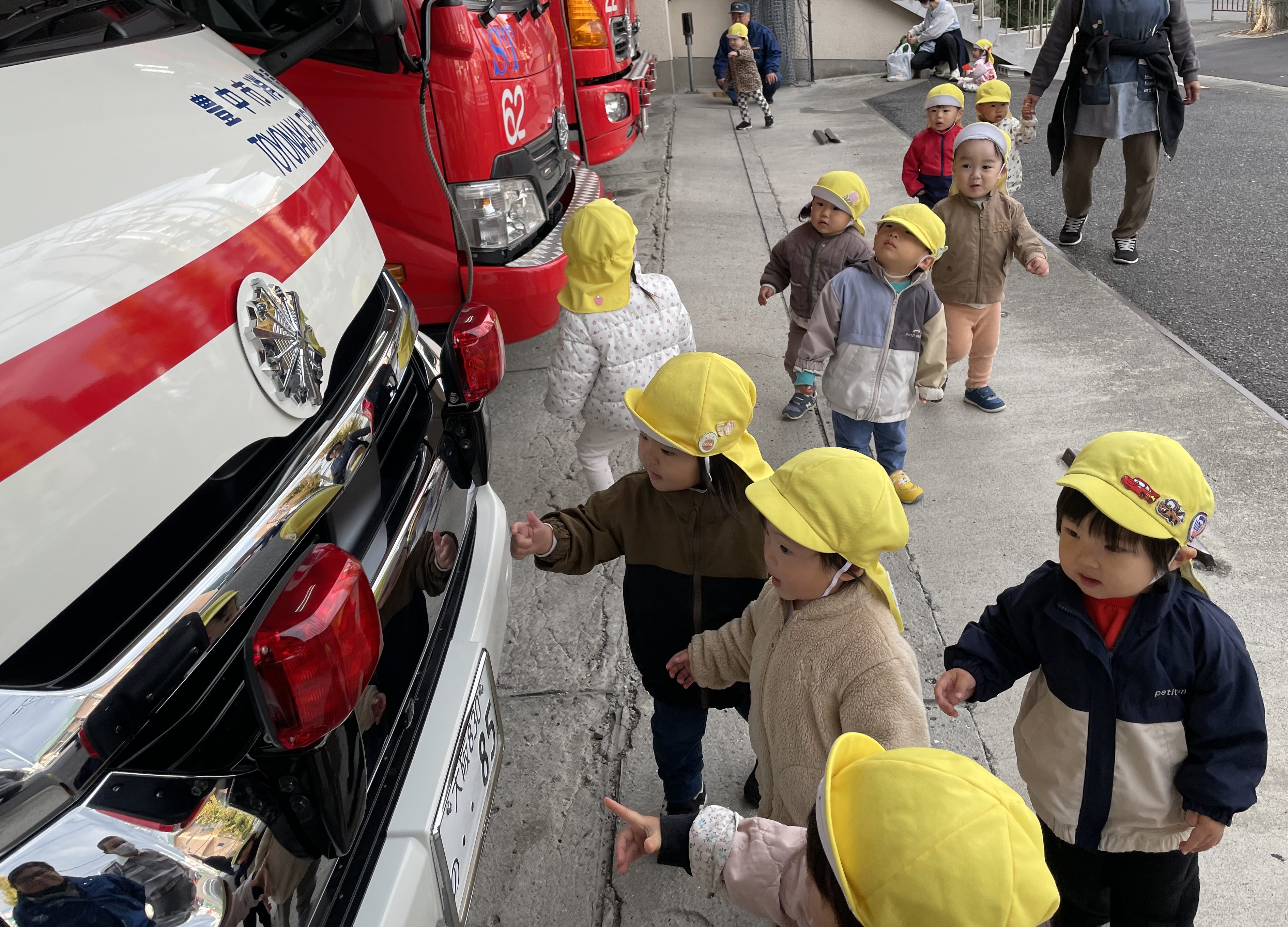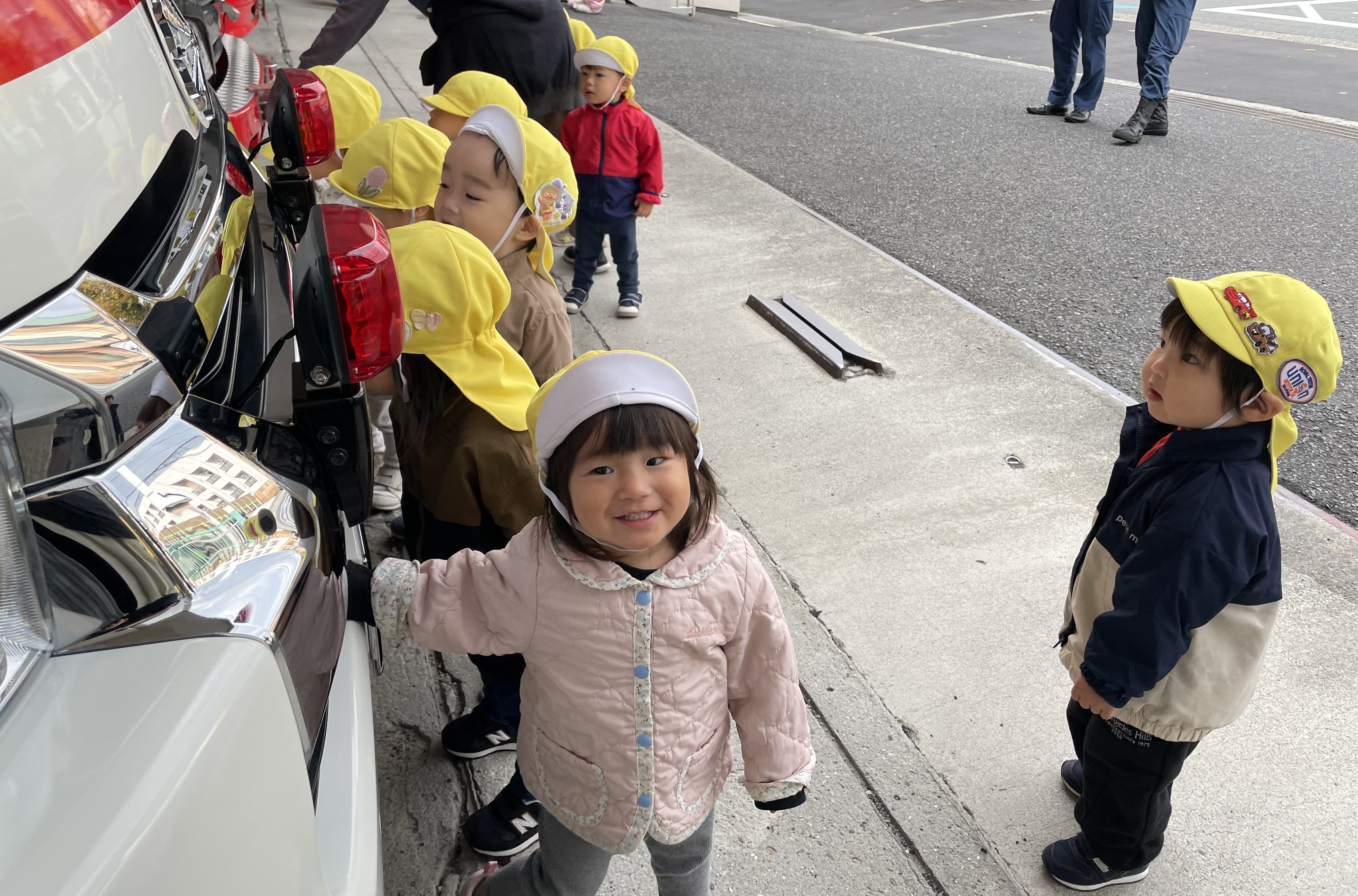 ランプを光らせ、サイレンを鳴らして出動する救急車を見送ることができて、嬉しそうなつき組さんでした!