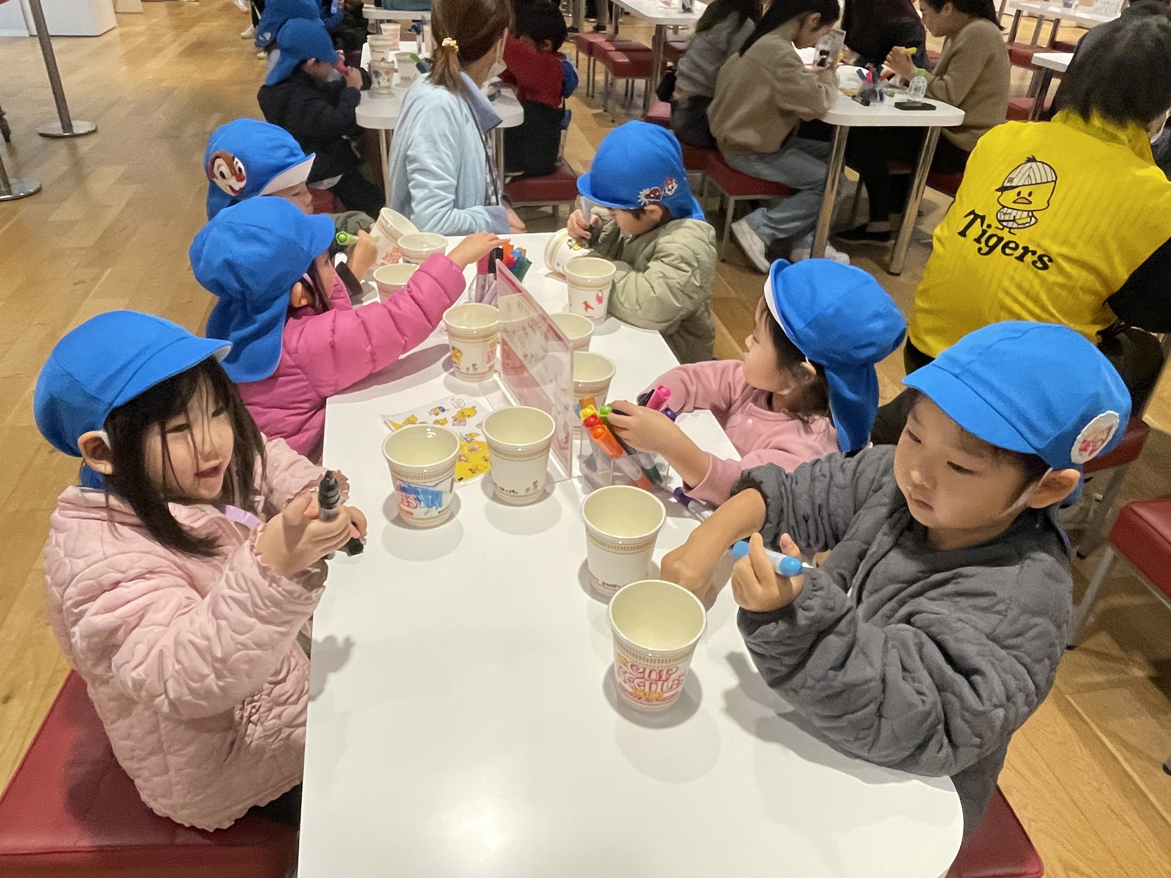 展示物のトンネルを抜けて…いよいよメインのカップ作りへ😊まずは、カラーペンを使って自由にお絵描き✏「〇〇はこの色が好きやから~💡」「ここにも描いていいの❔」とお話ししながら描いてましたよ✨