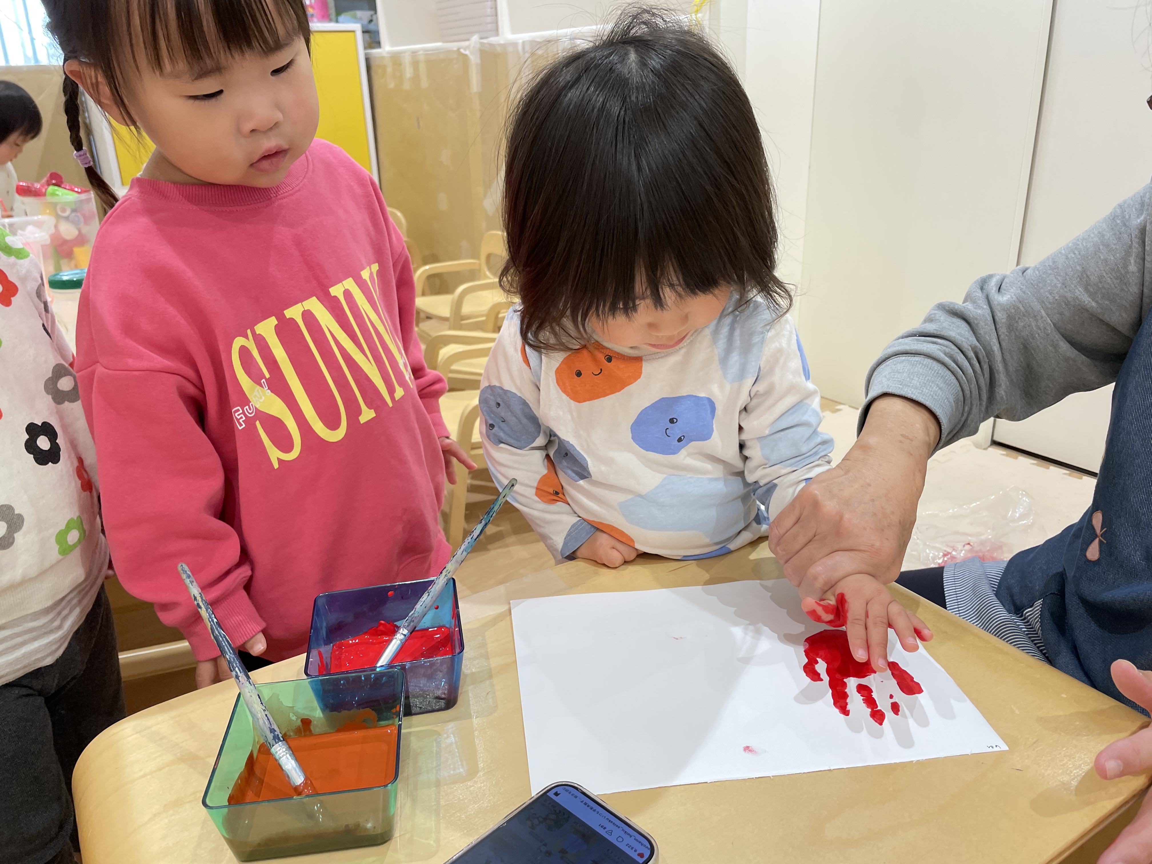今年最初の製作は手型とり。真っ赤な絵の具を手のひらにペタペタと塗って、ペタン🖐️と手型を取りました!