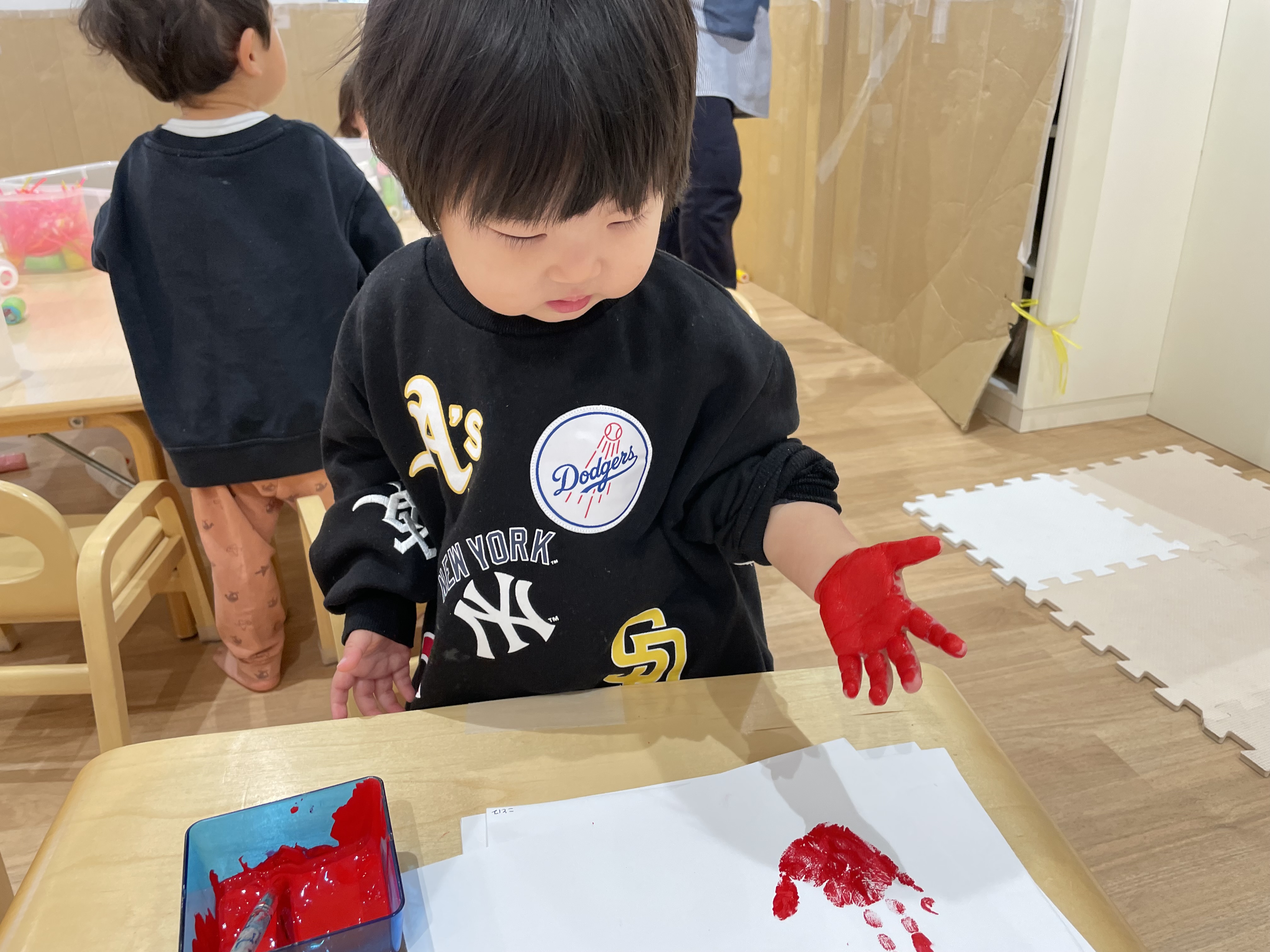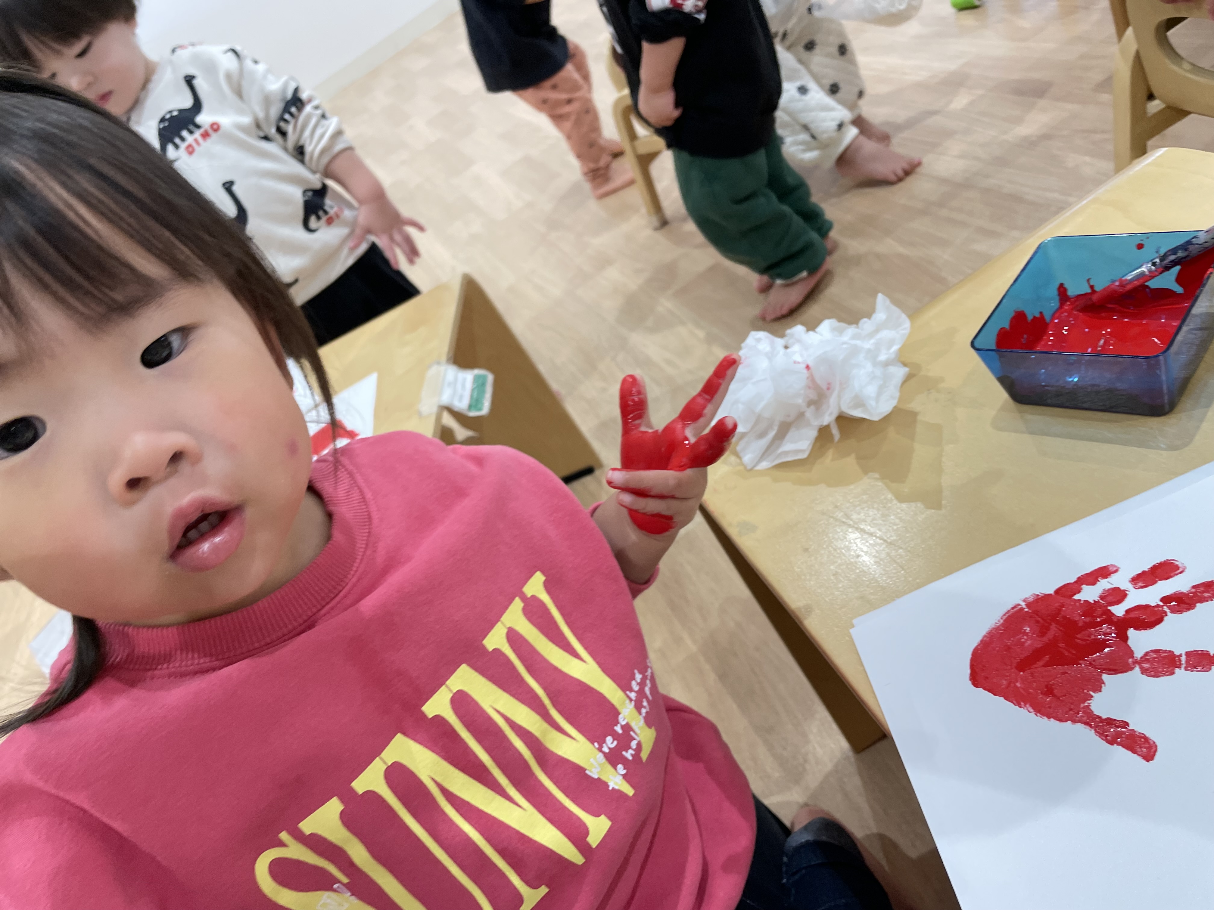 今年最初の製作は手型とり。真っ赤な絵の具を手のひらにペタペタと塗って、ペタン🖐️と手型を取りました!