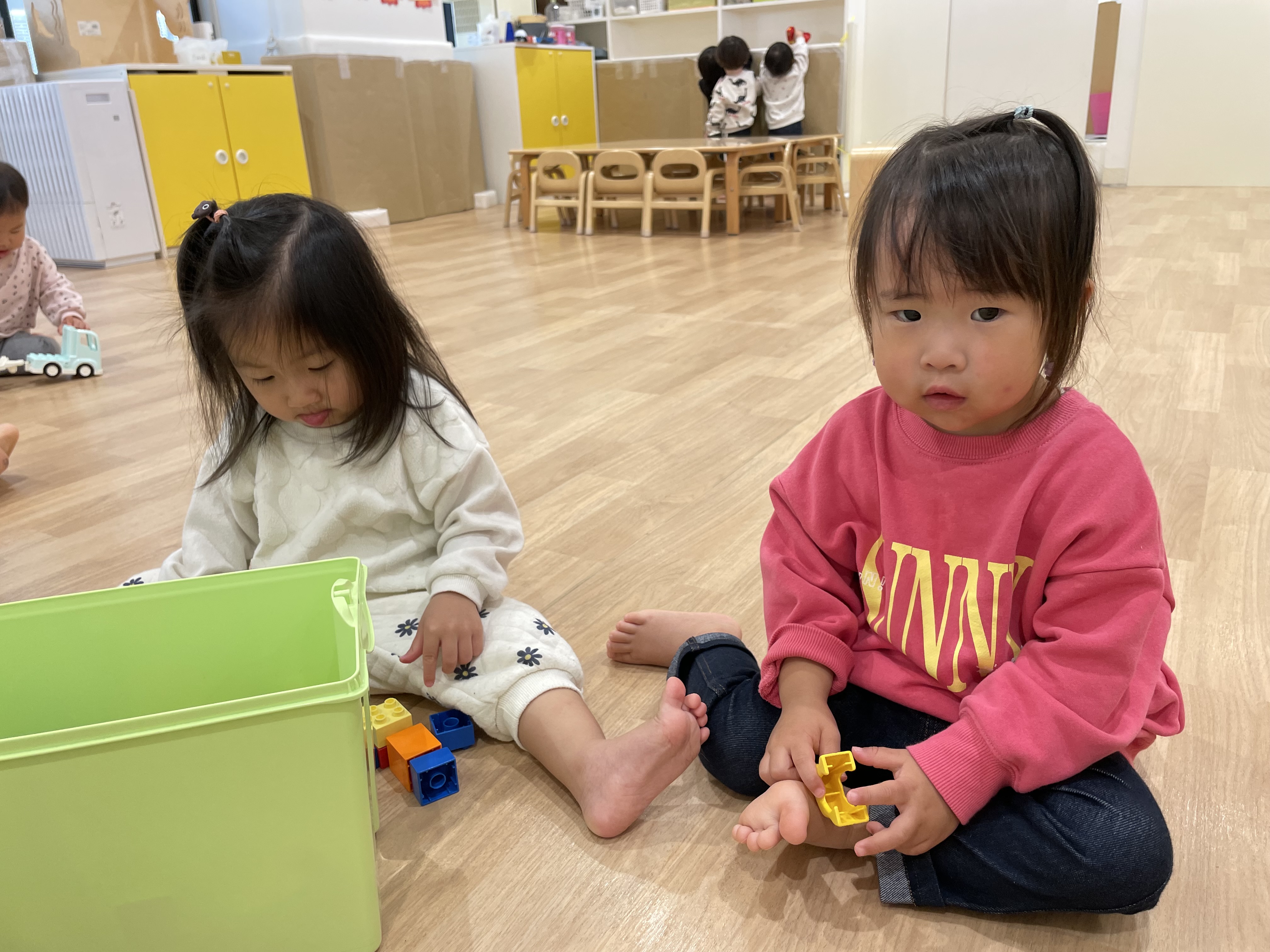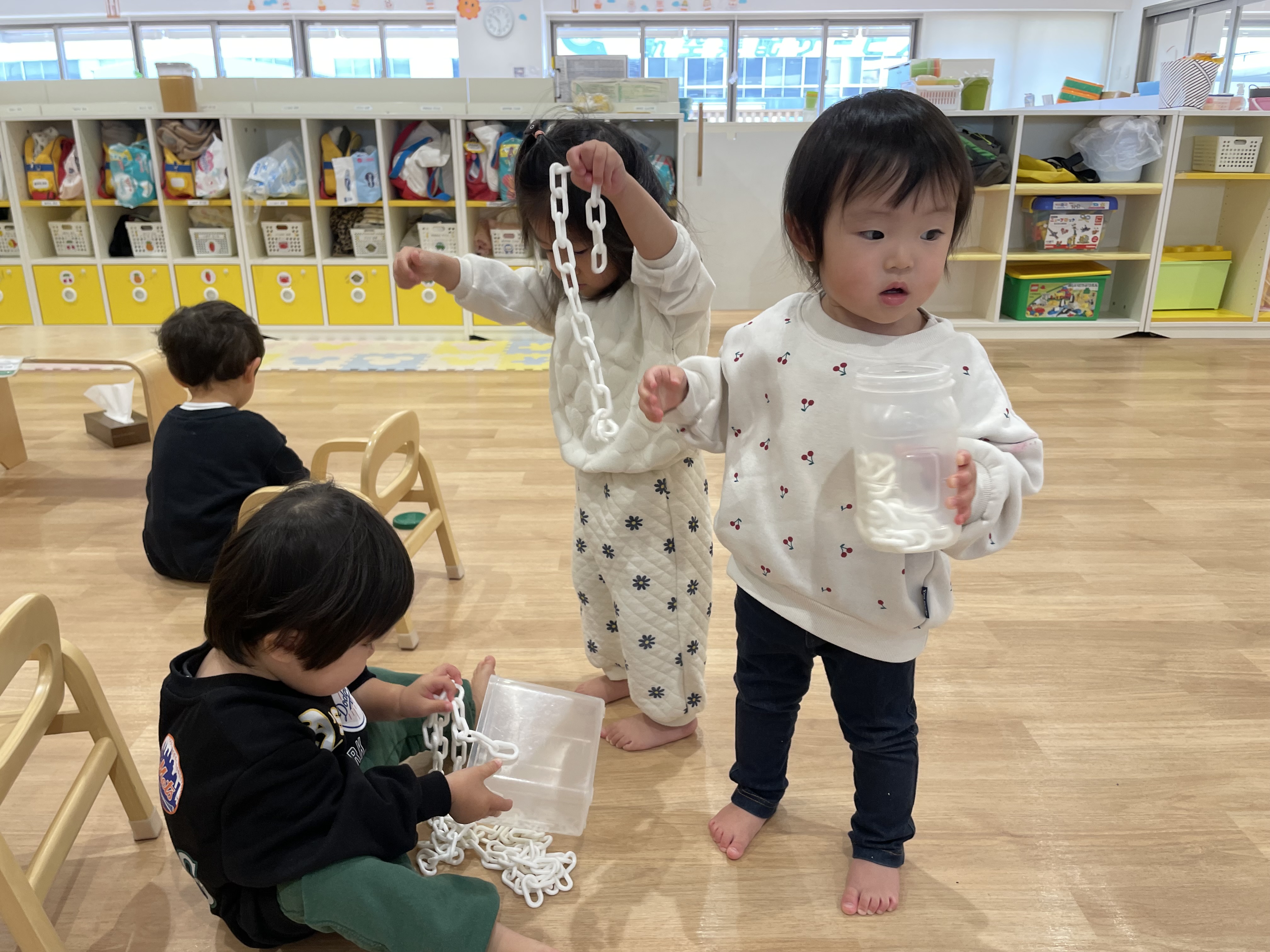 ポットン落としやストロー入れ、チェーン入れなど、集中して楽しんでいます!