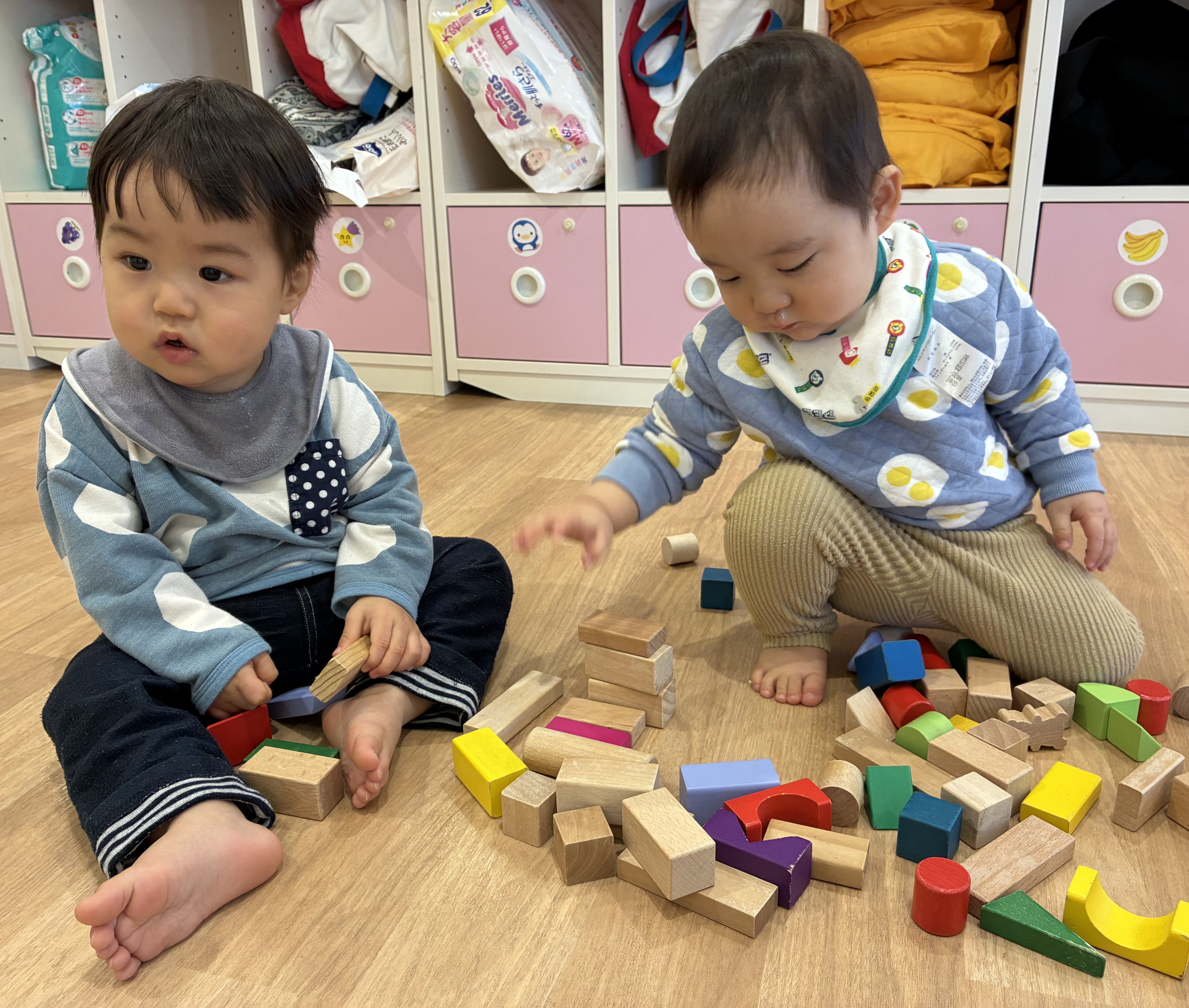 子ども達がお部屋を散策中見つけた積み木で遊ぶことにしたゆきぐみさん。