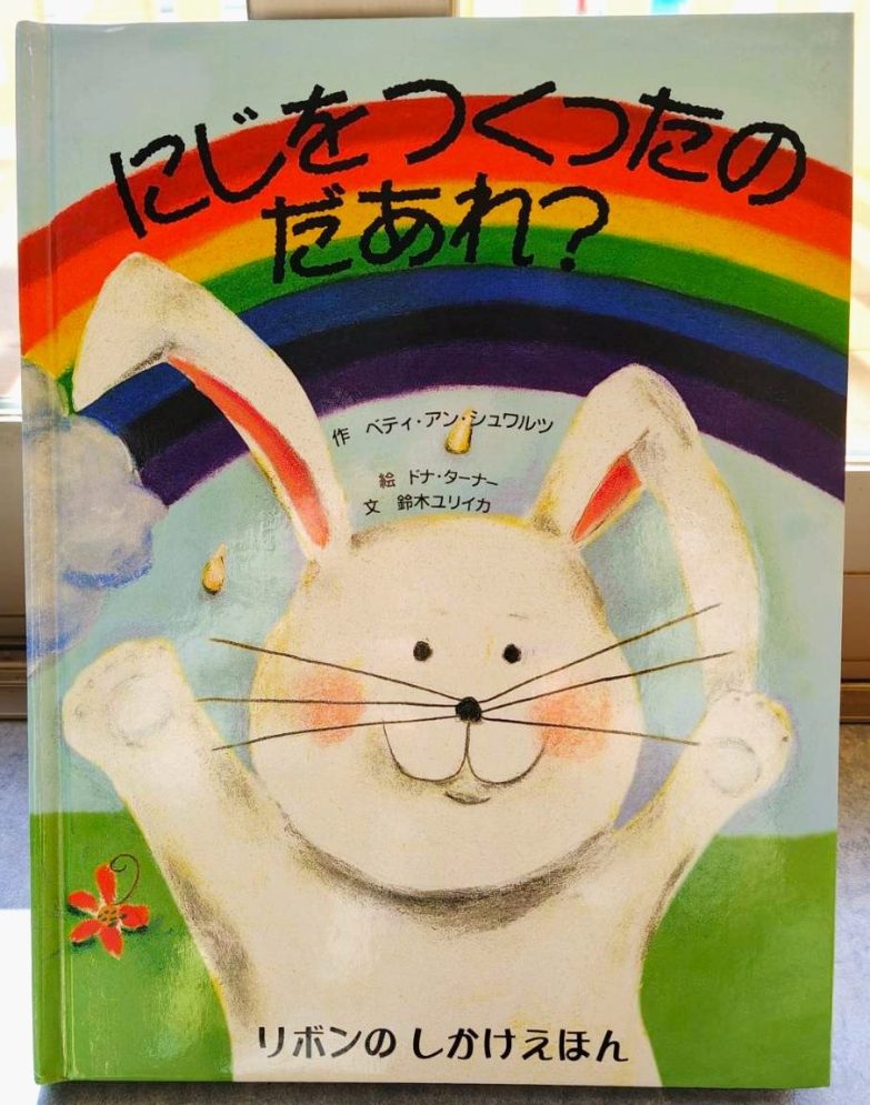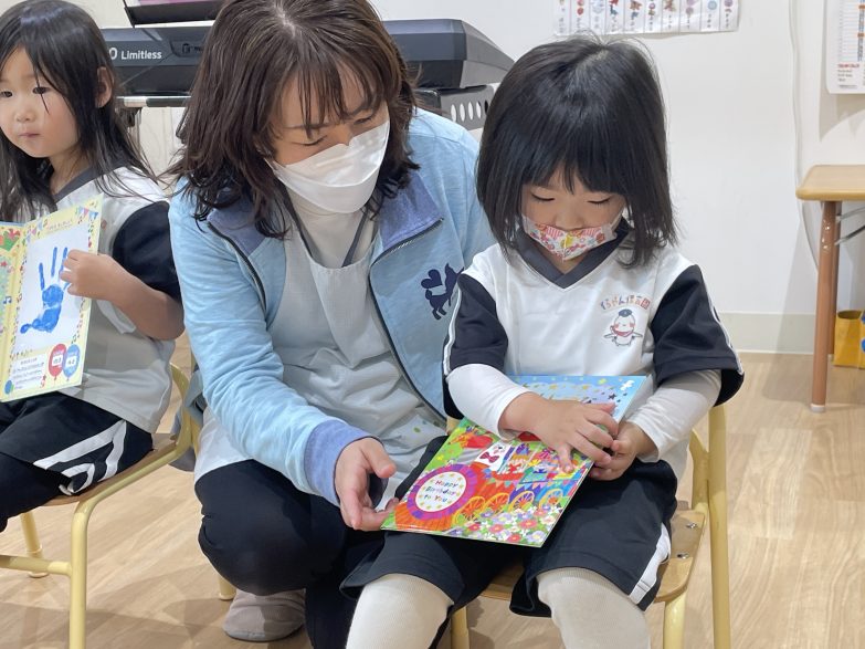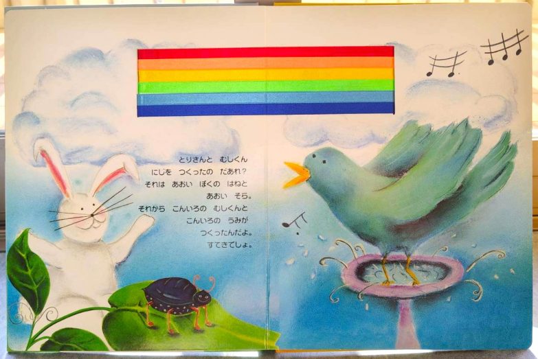 絵本「にじをつくったのはだあれ❓」では仕掛け絵本に釘付けでした😍「⭕️⭕️いろ〜」と言って増えていくにじの色に期待を膨らませながら答えていました笑