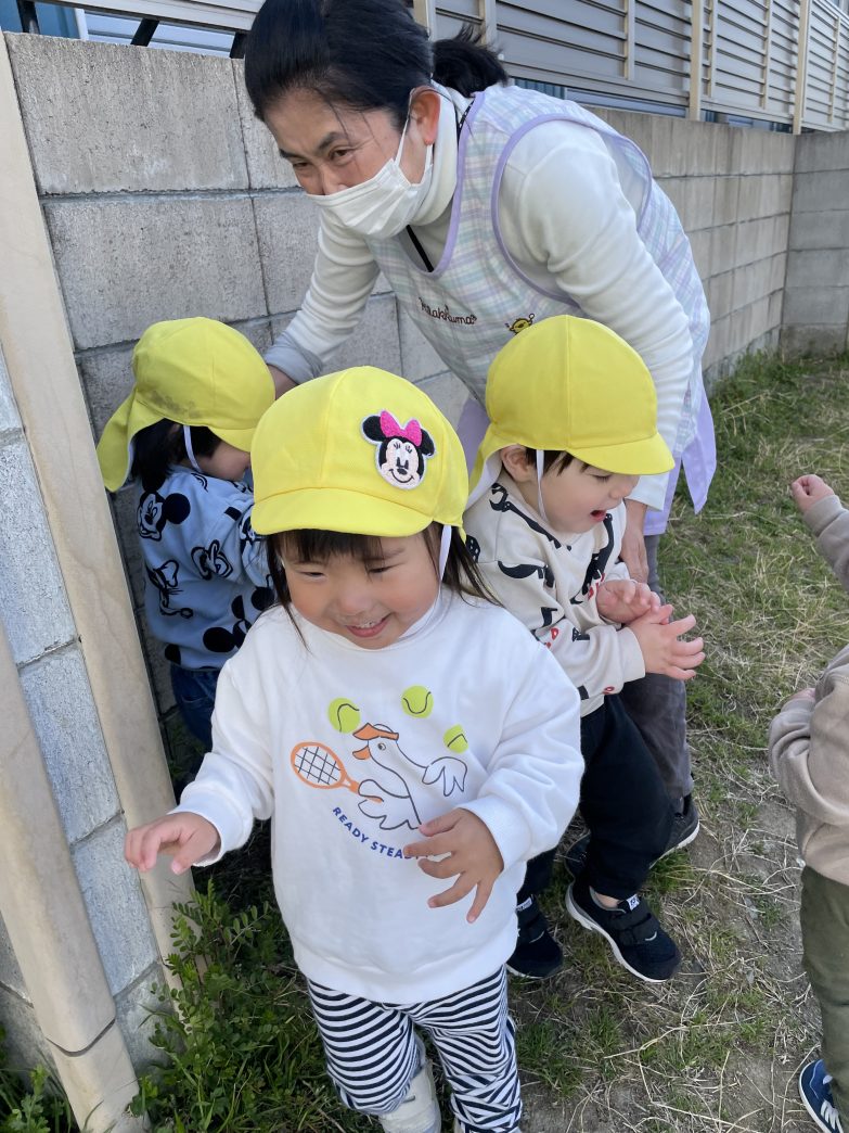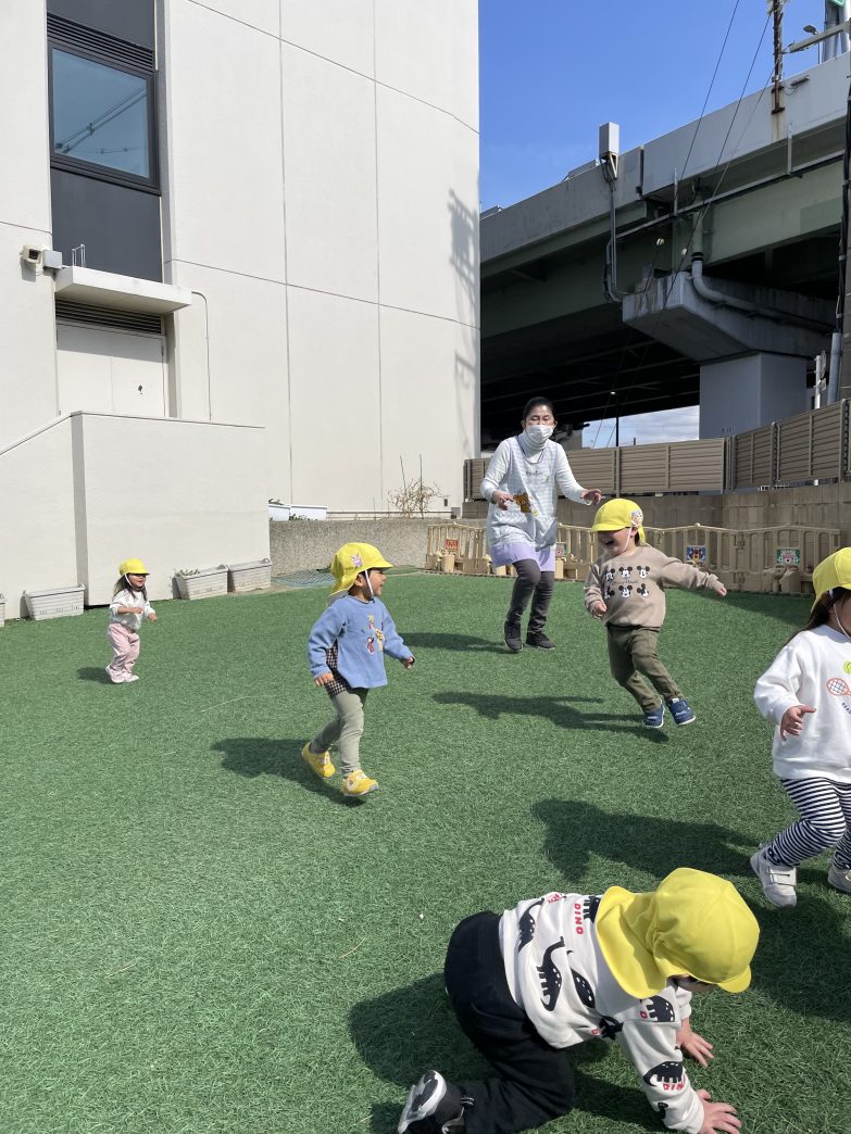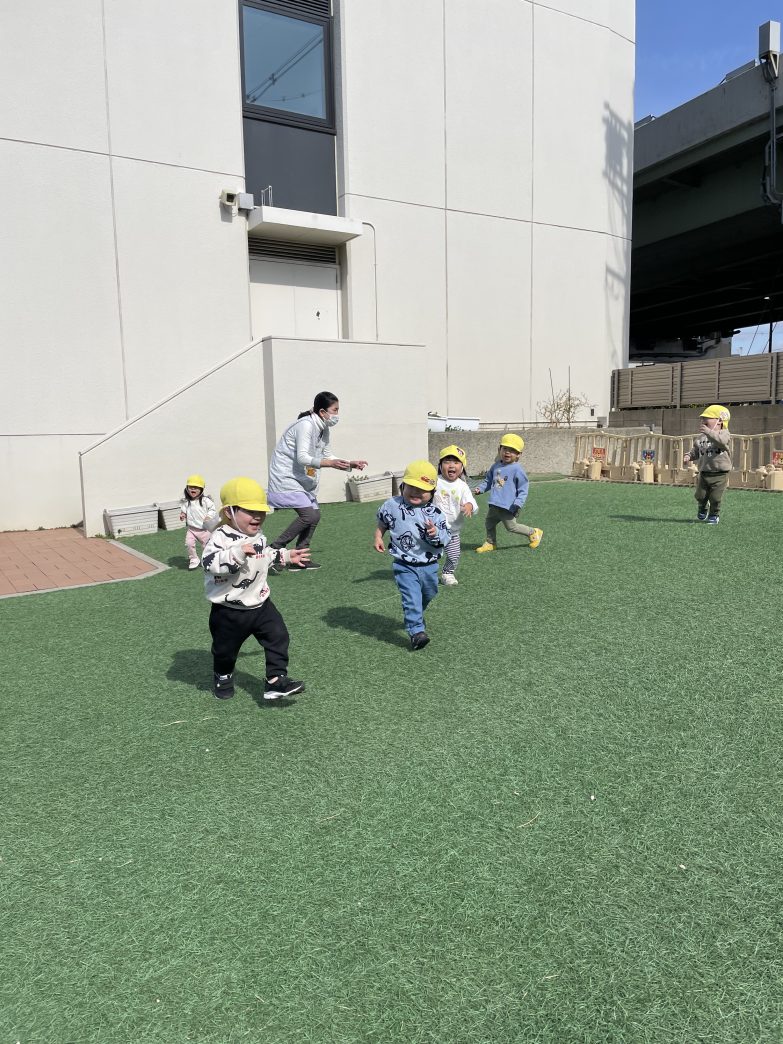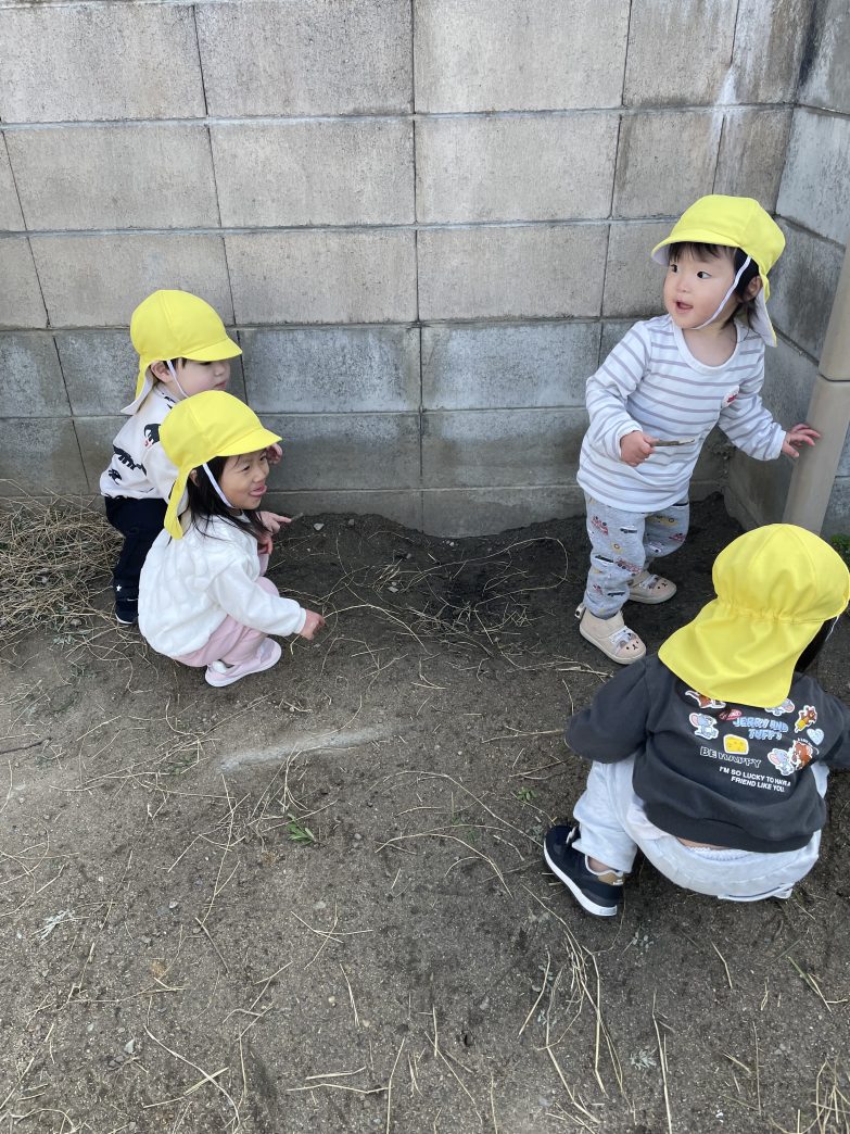 今日は子ども達も元気で天気も晴れていたので園庭に行き遊びました。追いかけっこやダンゴムシ探しなど楽しく過ごしました。