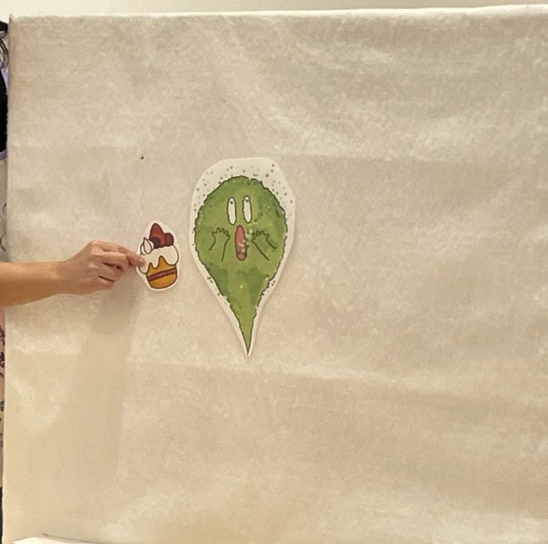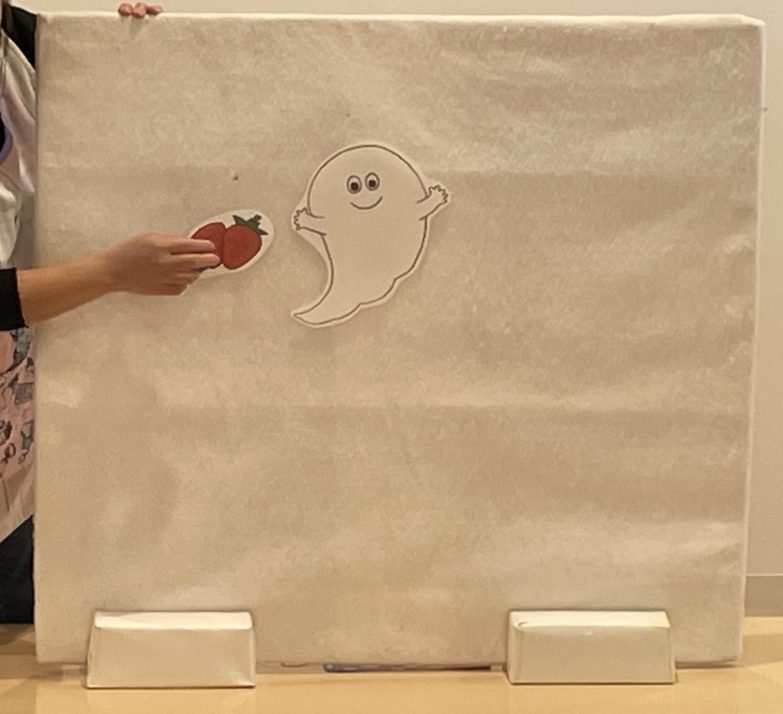 先生からのプレゼントは、「ばけばけばけたくん」のパネルシアター。白色のおばけから色や形が変わって、子ども達は食い入るように見ていましたよ😆