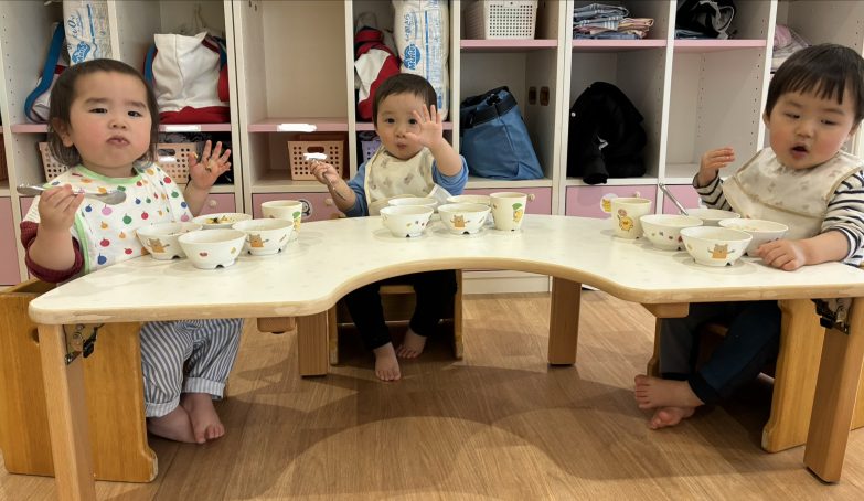 近頃のゆきぐみ保育室は子どもたちの楽しそうな言葉で溢れてます🥰「〇〇くんだ❗️」、「ダンダンして〜(からだダンダン)」、「やめて〜😫」、「ごめんね〜」、「はーい🙋」(おかわり欲しい時)‥新しい言葉を聞くたびに保育者も驚かされます😳